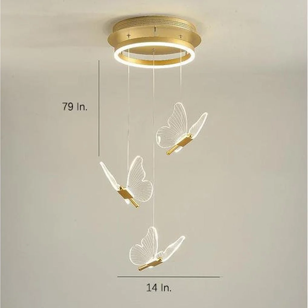 - The Metallic butterfly body gives it a sense of art of heavy industry and shows the collision between art and industry. This modern minimalist chandelier is suitable for staircases and entrance halls of houses with different ceiling heights. The chain is 71 inches long.
