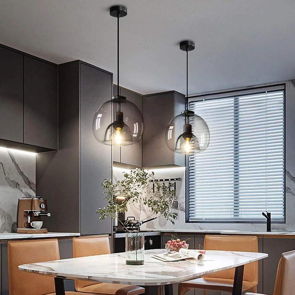 • Smoked round glass shades paired with a matte black finish pendant light create a retro industrial look for places like kitchen islands, hallways, dining room, bedrooms, cafe, bars and offices.