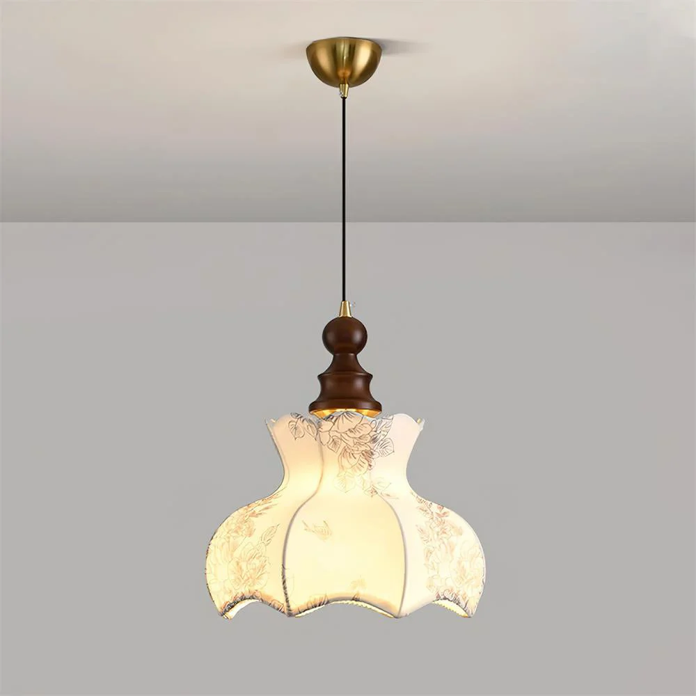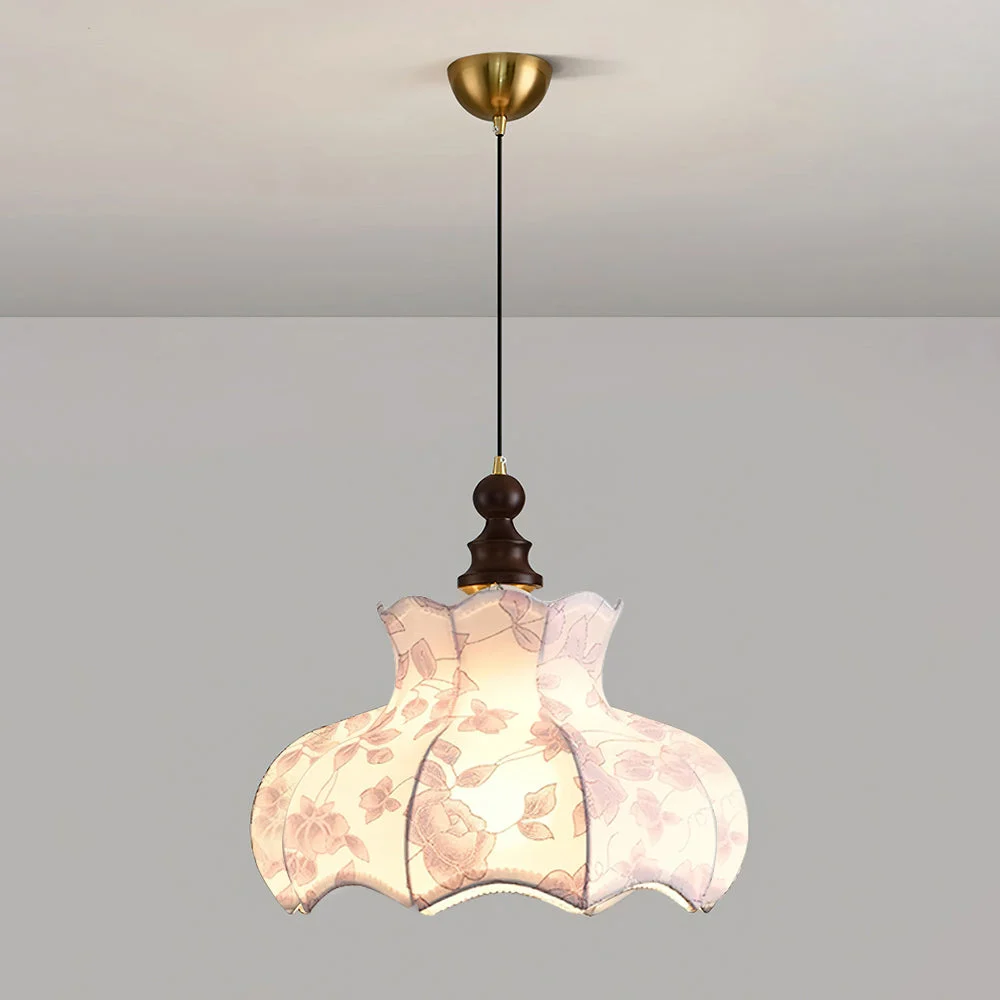 Add vintage elegance to your home with the Liko Pendant Lamp. Its unique design boasts a gold decorative sphere perched atop a sleek metal base, joined by a black cable to a stunning floral-patterned white shade. Its timeless style and intricate details ensure it fits seamlessly into any setting. Elevate your interior decor with this beautiful, eye-catching pendant lamp.