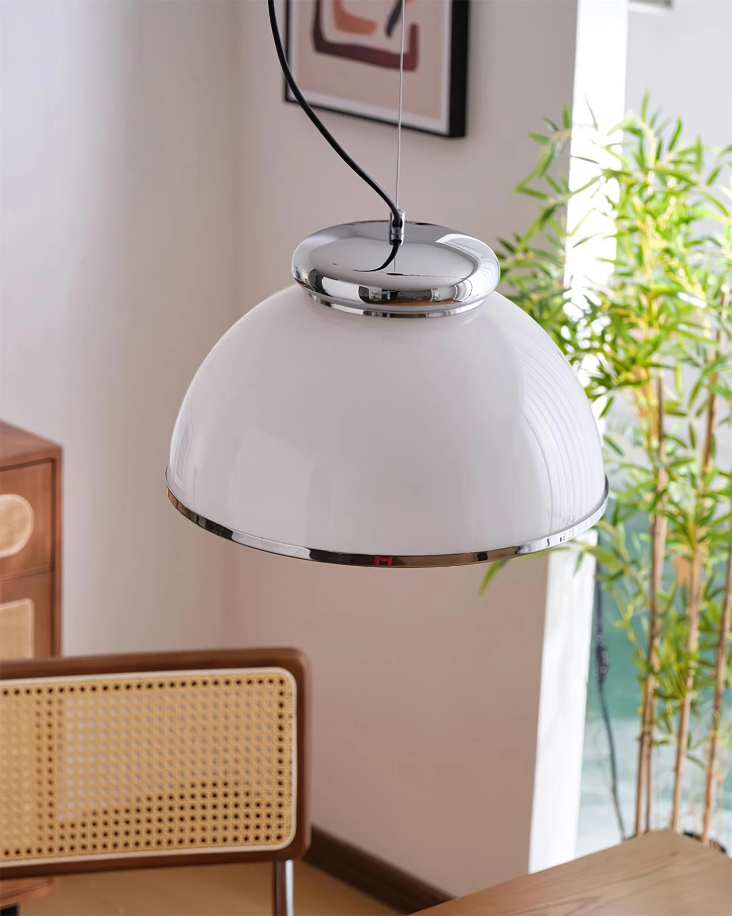 The Lita Pendant Lamp is a sleek, contemporary light fixture that combines clean lines with a touch of modern elegance. Its smooth, glass shade is complemented by a polished chrome ring at the base, offering a chic, minimalistic look. Perfect for a variety of settings such as kitchens, dining rooms, or living areas, the Lita Pendant Lamp creates a warm, inviting atmosphere while adding a sophisticated touch to any space.