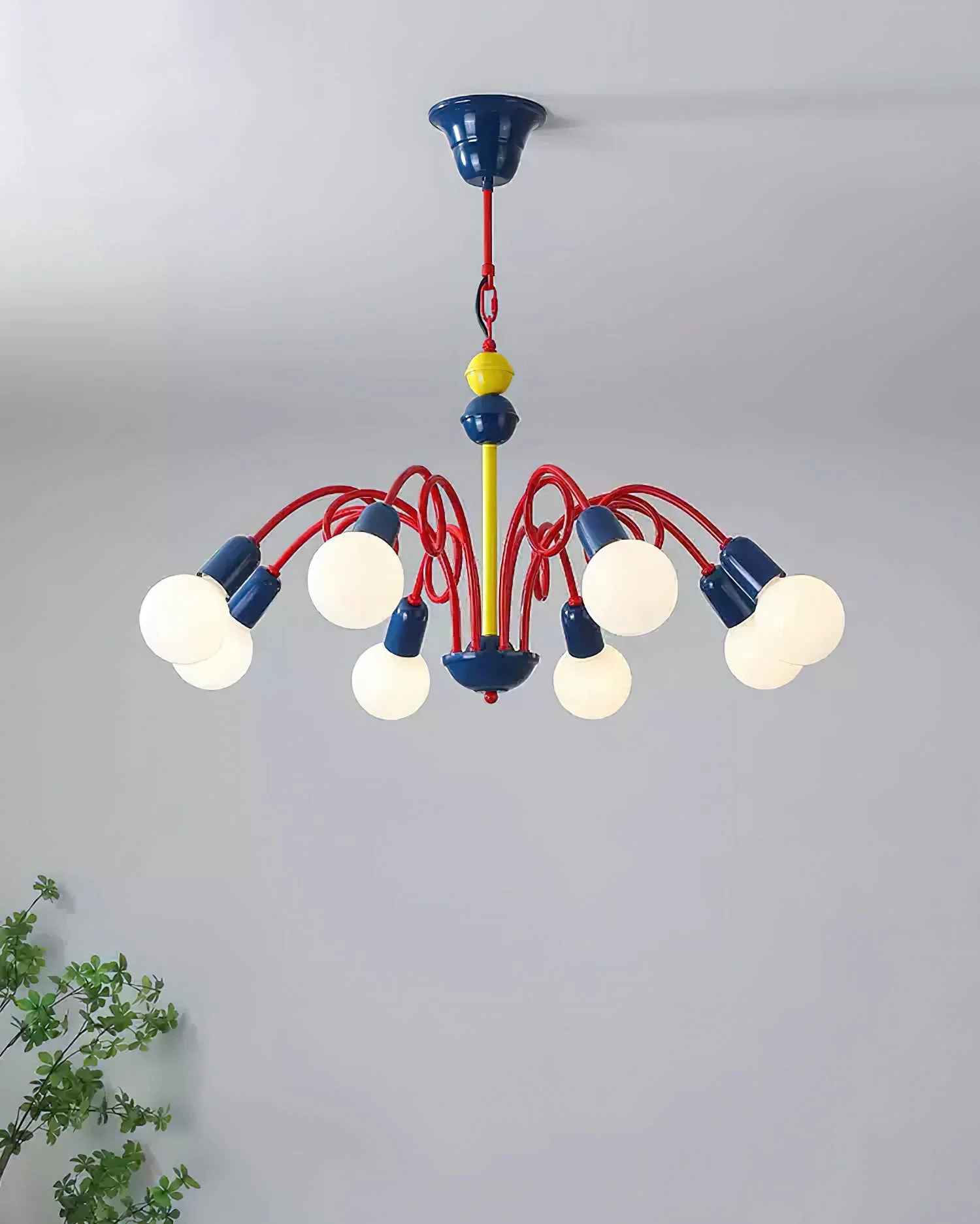 This Luminosa Chandelier features bold colors and a unique design, resembling a magical device straight out of a fairy tale, adding a touch of fun and energy to your home. The red curved arms paired with a blue and yellow base hold five round bulbs, like glowing fruits suspended in mid-air, emitting a soft, warm light. Whether in the dining room, living room, or a child’s room, this chandelier becomes the focal point of the space, illuminating every joyful moment and bringing a distinctive artistic vibe to your home.