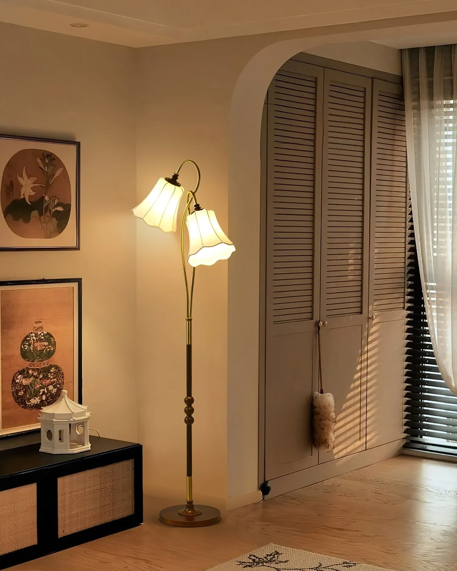 The Magnolya floor lamp a charming addition to any space from the exclusive collection at Docos. This elegantly designed lamp features a rich brown wooden pole complemented by delicate Metal details, creating a sophisticated vintage look. The curved arms lead to beautifully shaped lampshades, offering a warm and inviting glow.
