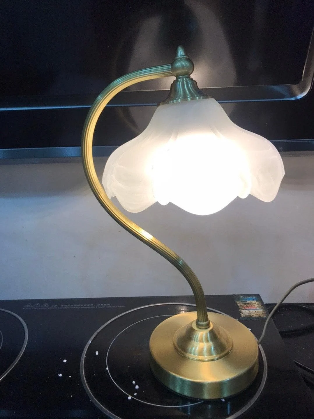 Magnolya Flower type glass shade is ultra-chic with a stunning brass gold finish, This table lamp set works beautifully by the bedside on a nightstand, console table, in the home office, living room, or dining area.
