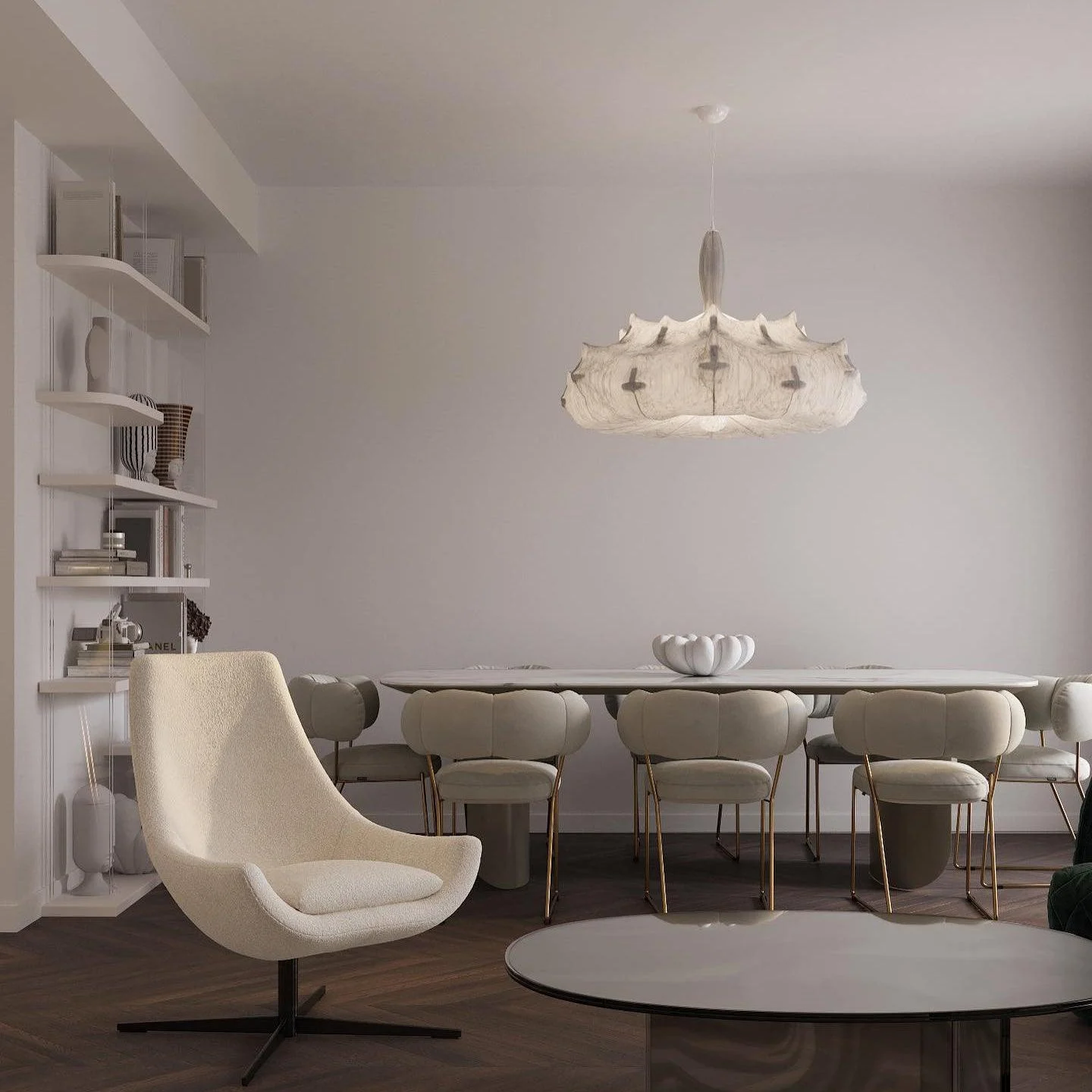 The Marcel Chandelier is an exquisite suspension lamp designed to cast soft diffused lighting. Its internal steel structure is meticulously coated with a special “cocoon” resin, resulting in a one-of-a-kind diffuser, further protected by a clear sprayed finish. The chandelier boasts transparent polymethylmethacrylate “candles,” and at its heart, a faceted crystal globe adds a captivating sparkle effect.