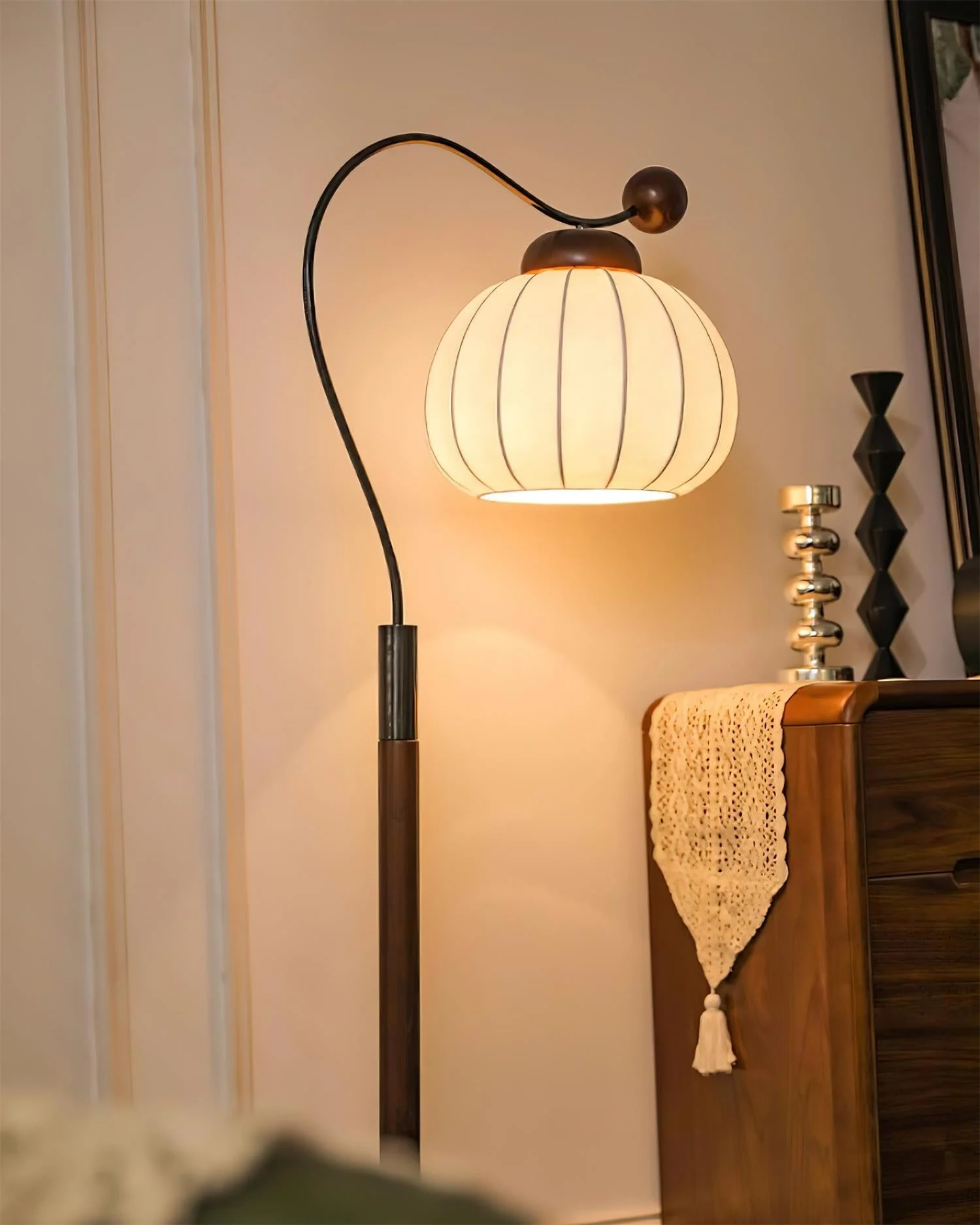 This Marisa Floor Lamp becomes the focal point of any room with its inviting curves and soft illumination. The elegant form is composed of a sleek wooden pole and gracefully arched arm, topped with a light and airy white lampshade that seems to breathe life when lit. The shade’s layered design not only creates a dynamic visual effect but also softens the light, casting a tranquil and cozy glow over your reading corner or relaxation area.