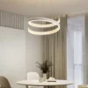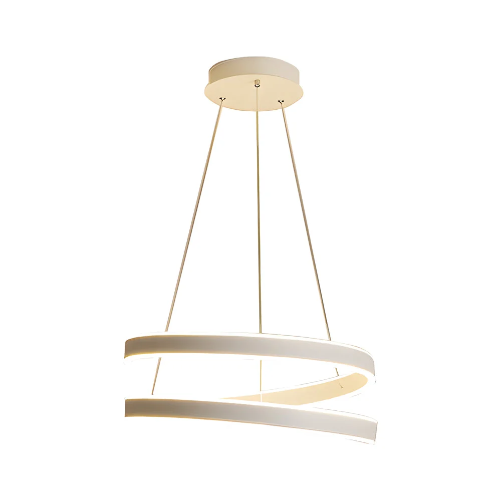 - Our matte white minimalist pendant light features a unique ring silhouette that embraces the appeal of modern design. Its white hue complements any interior decor, adding a touch of modern elegance to your home. The abstract spiral effect on its metal lamp body adds a touch of flair to its classic white finish, creating a visually striking appearance. Whether you’re lighting up a cozy nook or a spacious living area, this dimmable chandelier is a great choice, especially for spaces like dining rooms, living rooms, bedrooms, and dens.