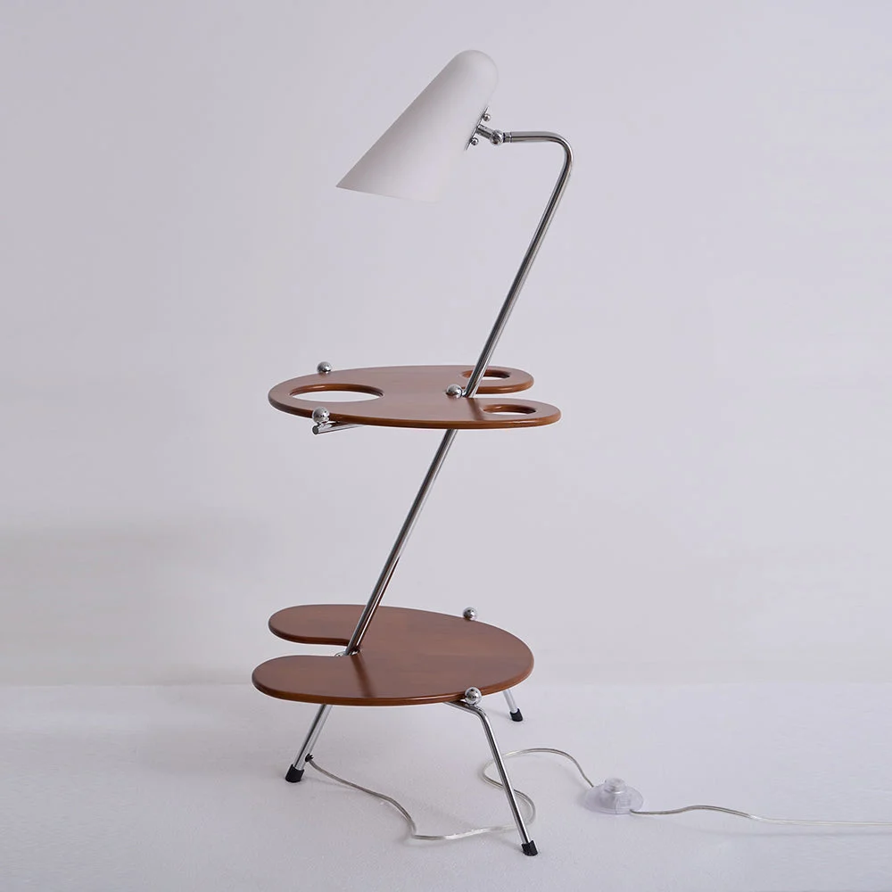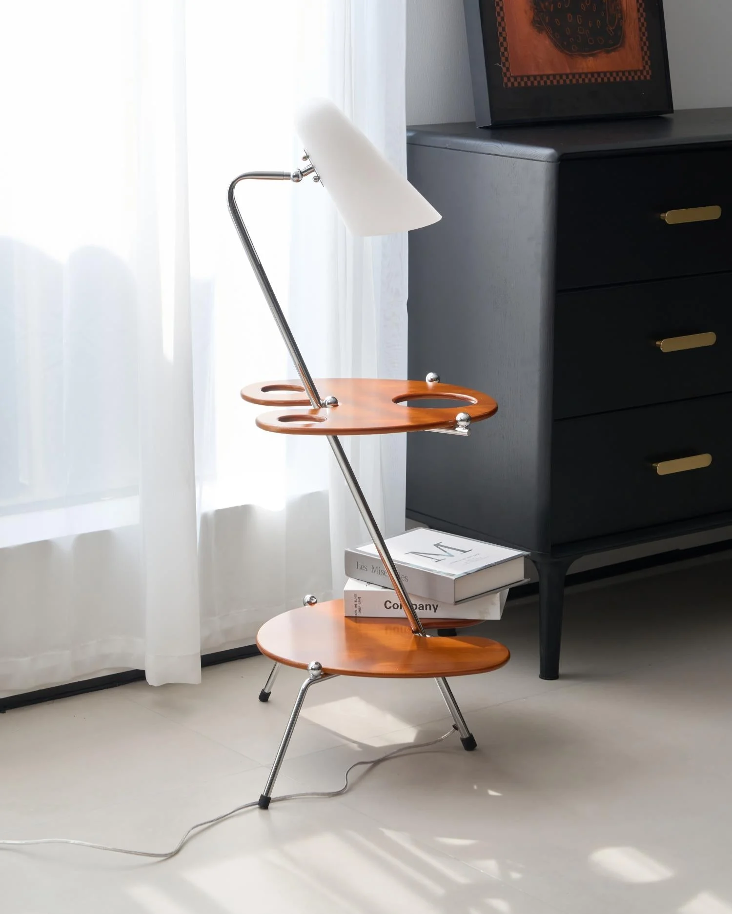 Blending sculptural elegance with smart functionality, the Melder Floor Lamp is more than just lighting—it’s a versatile design piece. The sleek steel frame supports dual-tiered wooden shelves, offering space for essentials while maintaining a light, airy aesthetic. Its adjustable opal shade casts a warm, inviting glow, perfect for reading or ambiance. Whether placed beside a sofa or next to a cozy reading nook, the Melder seamlessly integrates modernist charm with everyday practicality.