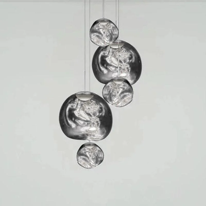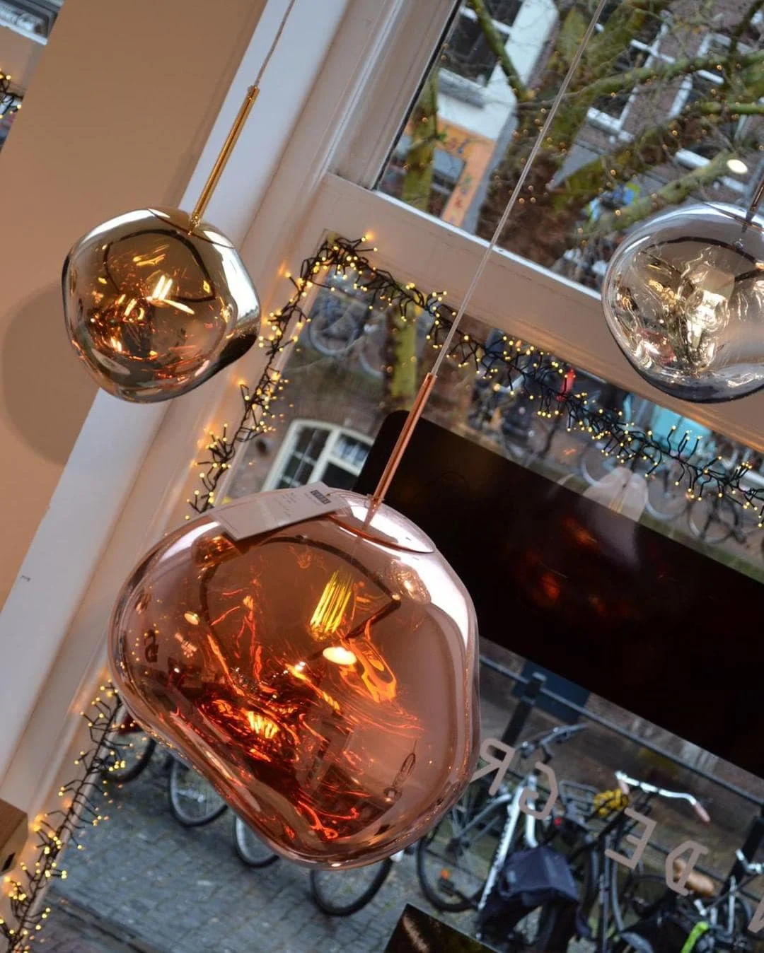 Melt is a beautifully distorted pendant in a modern Copper finish and matching ceiling rose. Emitting an attractive, mildly hallucinogenic light, this ceiling light creates a mesmerizing melting hot-blown glass effect when on and a mirror-finish effect when off. it emits an attractive, mildly hallucinogenic light. Melt floor lamps are available in copper, chrome and gold.