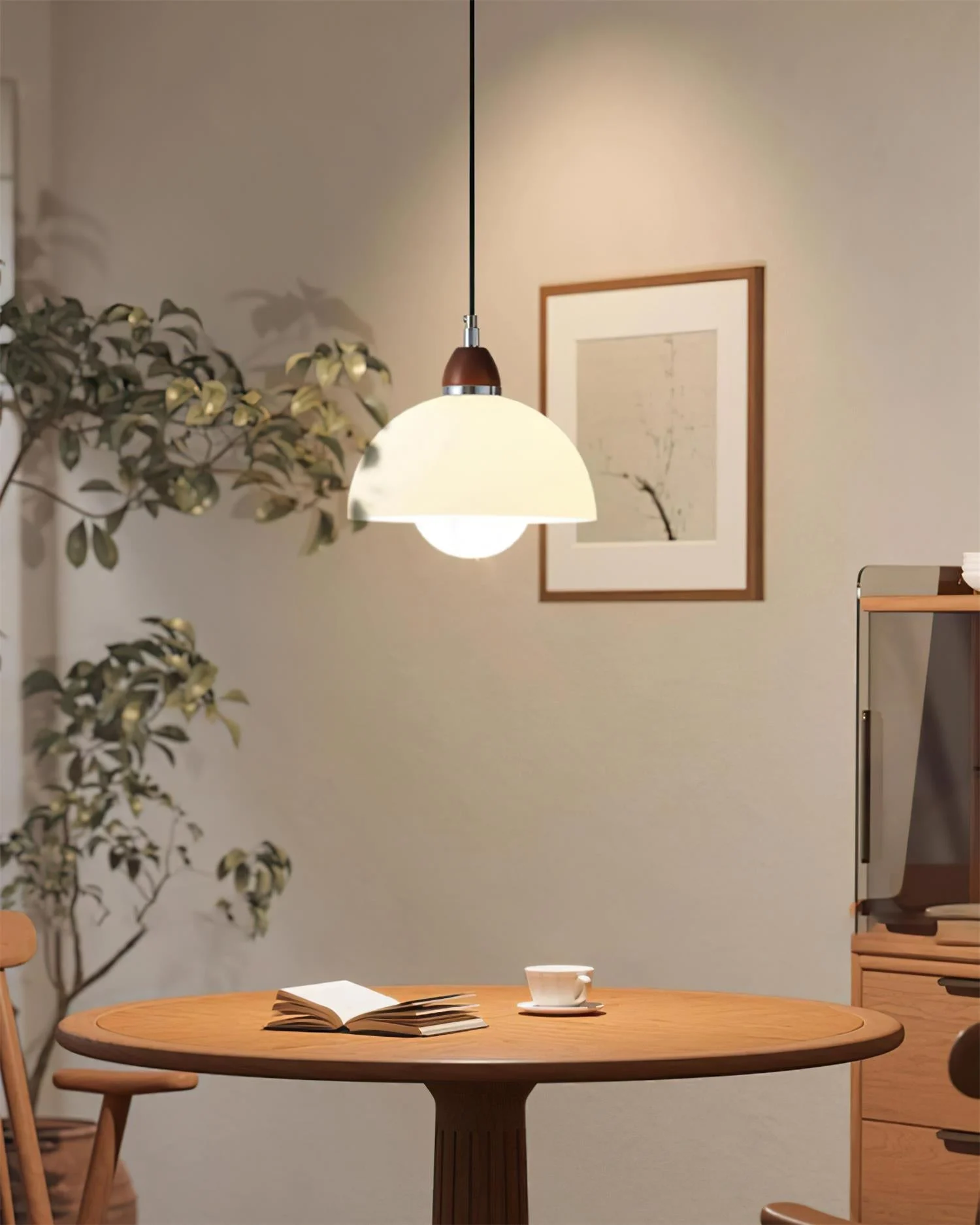The Milagro Pendant Lamp is a stunning blend of modern design and natural elegance. Featuring a sleek white metal shade with a subtle dome shape, paired with a warm wooden accent at the top, this light fixture adds a touch of sophistication to any space. Its minimalistic design and soft, diffused light make it ideal for a variety of settings, including dining rooms, kitchens, and living areas.