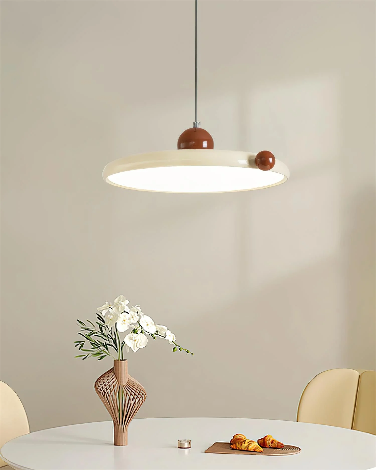Inspired by cosmic forms, the Minka Pendant Lamp brings a sense of orbiting elegance to your space. The smooth, wide disc is complemented by contrasting spherical details, creating a design that feels both grounded and dynamic. Its soft glow casts a serene ambiance, highlighting its artistic simplicity.