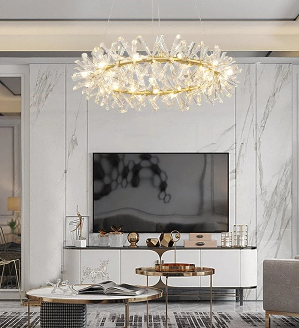 The Mira Crystal Ring Chandelier collection includes single and double layer ring chandeliers. The chandelier is adjustable, made of polished steel, gold-plated and embellished with clear crystal. Use them throughout the house in hallways, living rooms, bedrooms or anywhere you like.