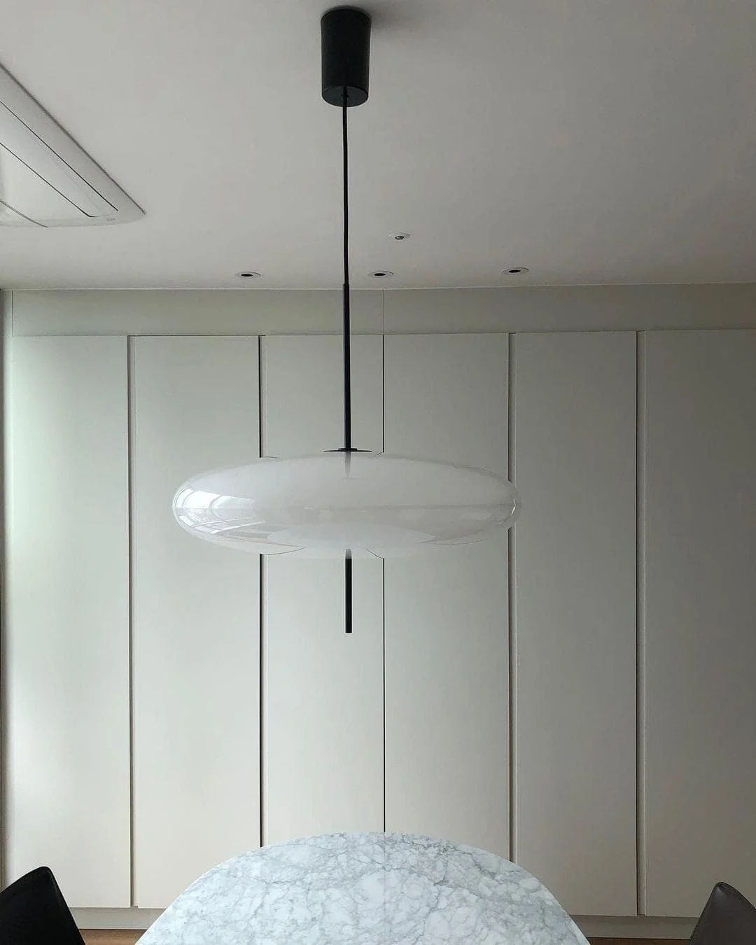 Model 2065 consists of a diffuser made of two joined opalescent saucers, suspended from the ceiling with a black-painted aluminium canopy. The simplicity of designer elliptical design and the lightness of the materials make for a seemingly weightless luminaire.