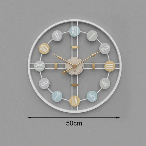 This attractive wall clock boasts a sleek design that blends with a variety of decorating styles. Crafted from iron dyed in gold, black or grey and featuring a unique, colorful design. This large wall clock fits seamlessly into any home or office.