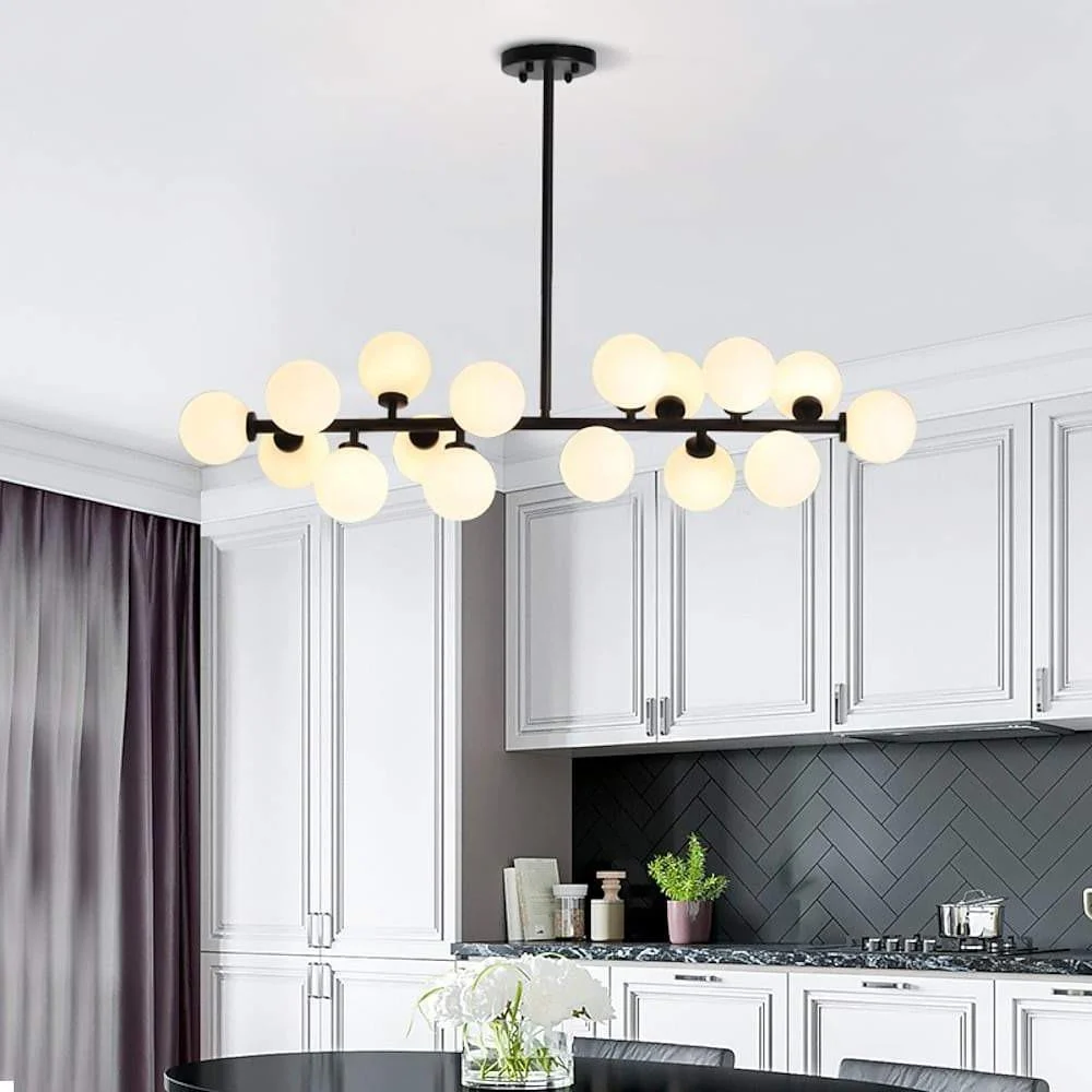 The Gold Kitchen Island Chandelier is a stunning centerpiece for any modern kitchen or dining area, offering a striking blend of elegance and contemporary design. Its frame, crafted from high-quality iron, supports 16 radiant, opaque milky white bubble glass globes that diffuse light in a mesmerizing display. The arrangement of these milky white bubble glass globes creates a harmonious balance, casting a warm and inviting glow that enhances the beauty of any space.