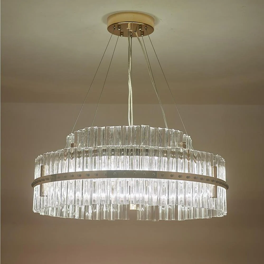 This 1-tier hand-cut crystal chandelier is a wide, horizontal ceiling lights suspended in the air. The body of this chandelier is a single large ring with dozens upon dozens of little crystal columns. The ring, from which these crystal rods hang, is encircled by stable metal with brushed gold finish. The entire modern luxury gold chandelier is held by three very thin, almost thread-like cables.