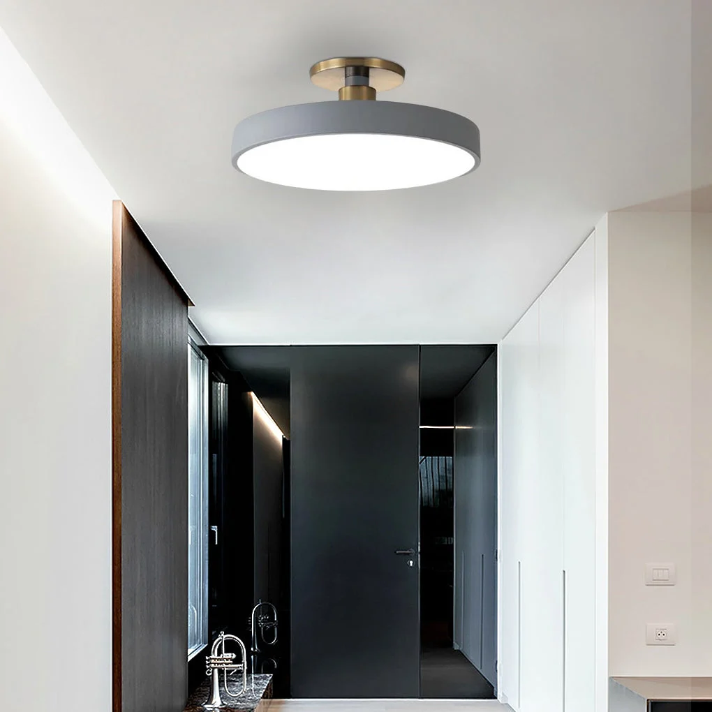 - Illuminate your home with this sleek and energy-efficient thick circular LED ceiling light. Designed with a minimalist Nordic aesthetic, this semi-flush mount light is ideal for creating a modern bright, sophisticated atmosphere. Unlike traditional halogen or incandescent lighting, this LED light consumes less energy, provides high brightness, and prevents flickering for a smooth, consistent glow.