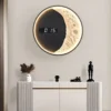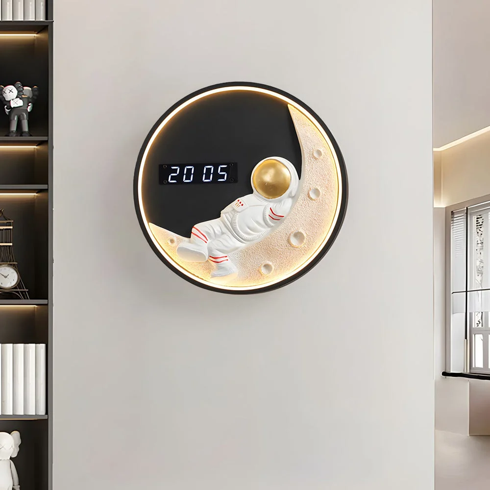 - This moon wall light has an LED digital time display screen that can clearly display the time. The wall lamp is made of metal and mimics the gentle glow of the moon. Choose between a bright white light for a modern and refreshing atmosphere, or switch to a warm golden glow for a cozy and enchanting ambiance. Its resin lunar surface texture adds a charming dimension to your decor. This wall clock is equipped with eye-catching and clear numbers, allows for easy time-reading from any angle in the room, and the clear display ensures that you will not miss any moment. Its round shape and cute space and astronaut elements can easily fit into any environment, decorating a hallway, bedroom, living room, dining room, or elsewhere.