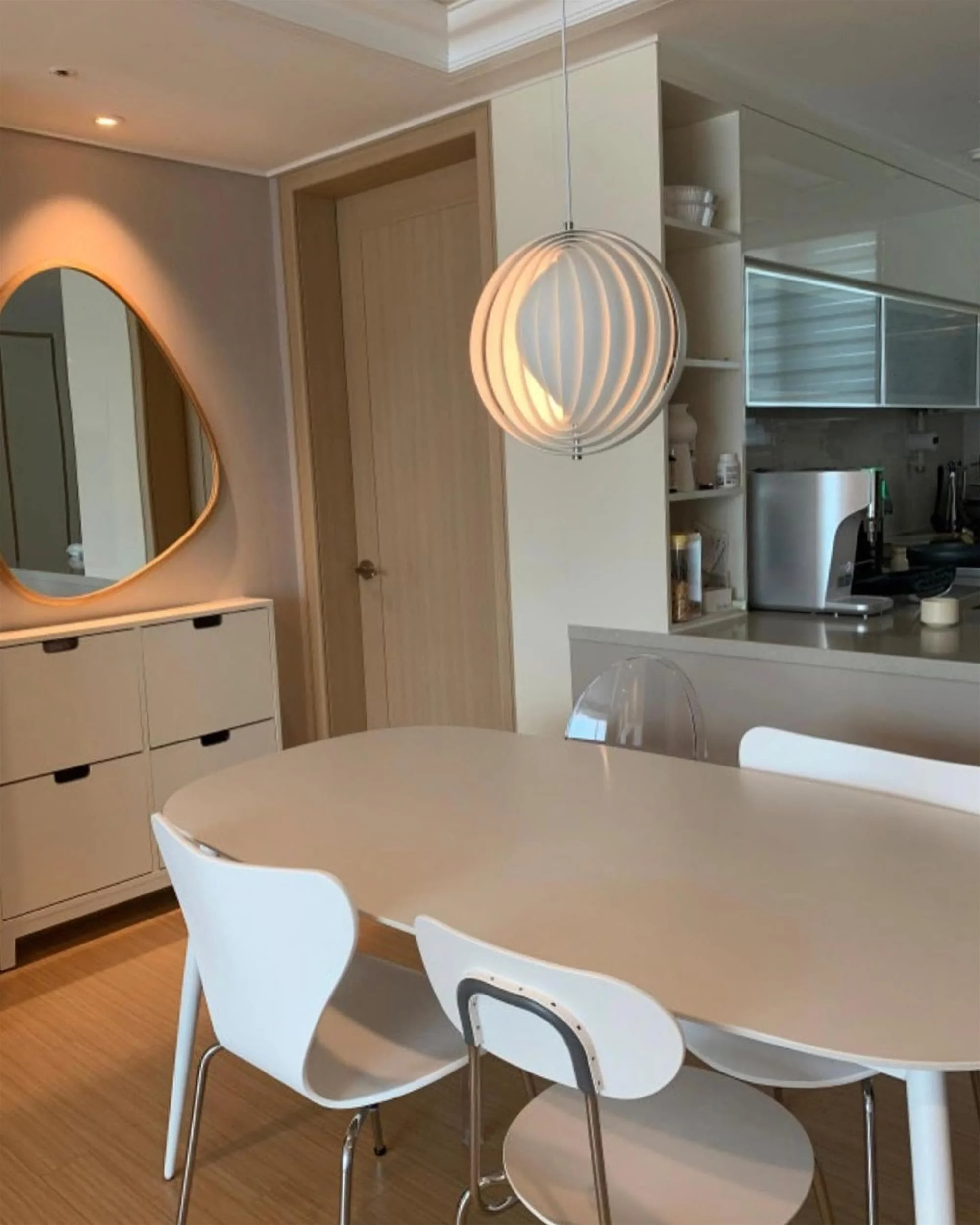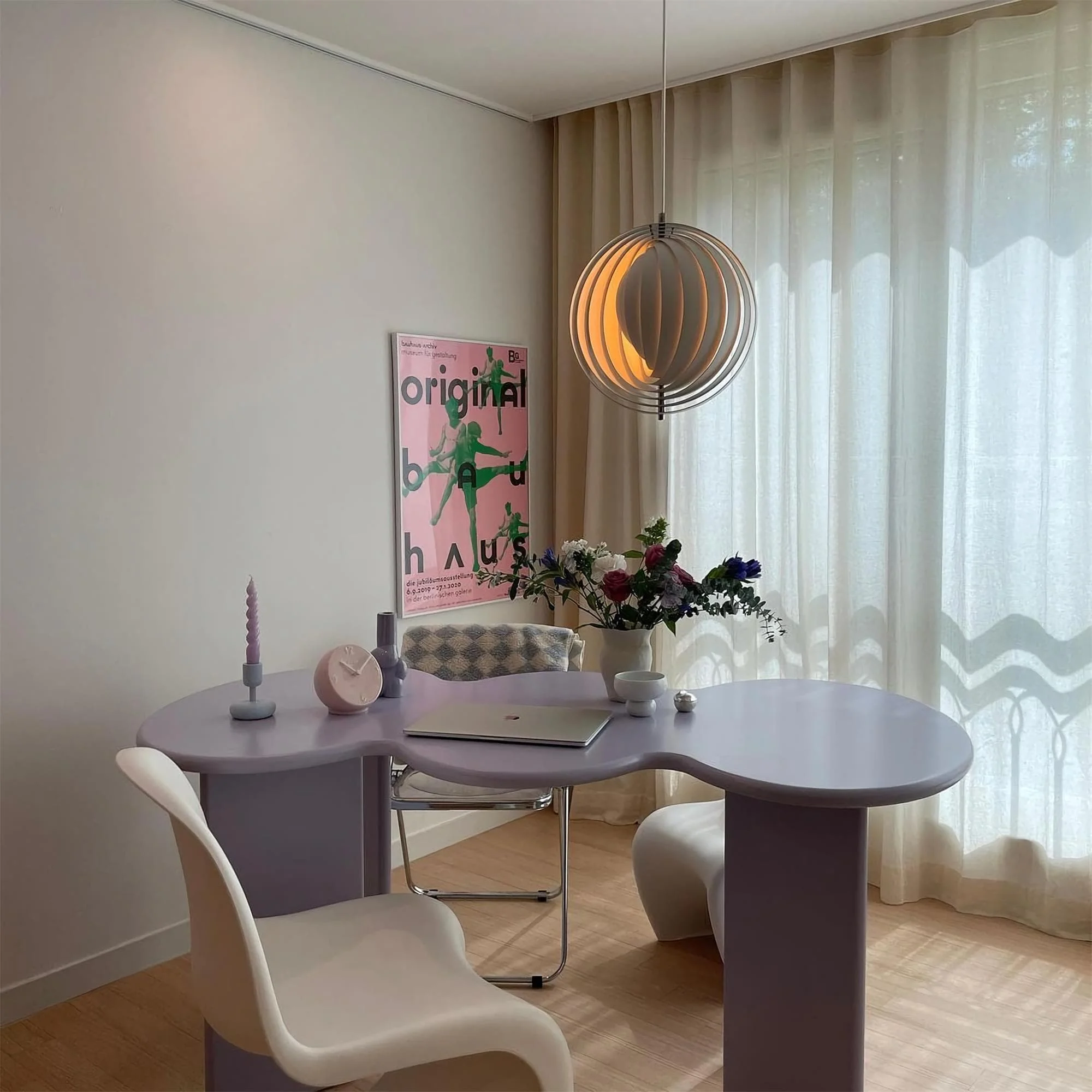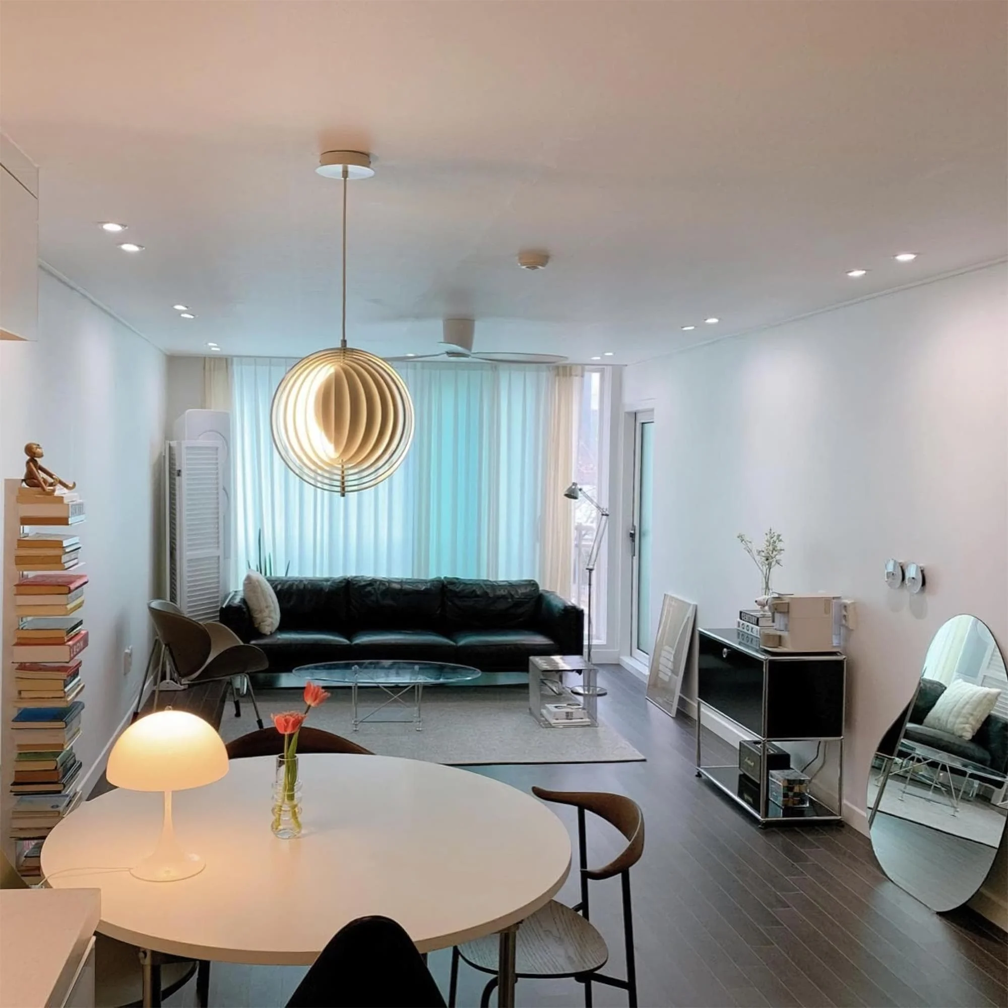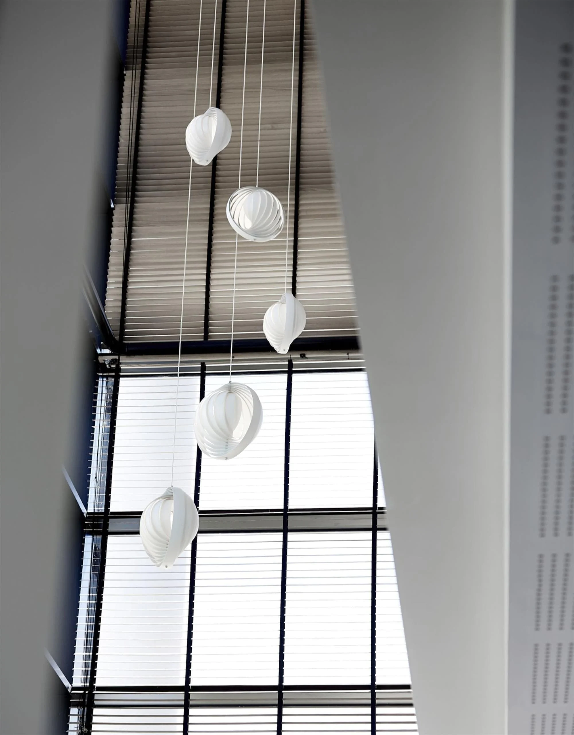 The iconic pendant is characterized by its fan-like design with ten ring-shaped lamellae perfectly positioned to provide a soft, ambient and glare-free light. The blades reflect and filters the light and the pendant changes its appearance depending on the angle at which you view it.