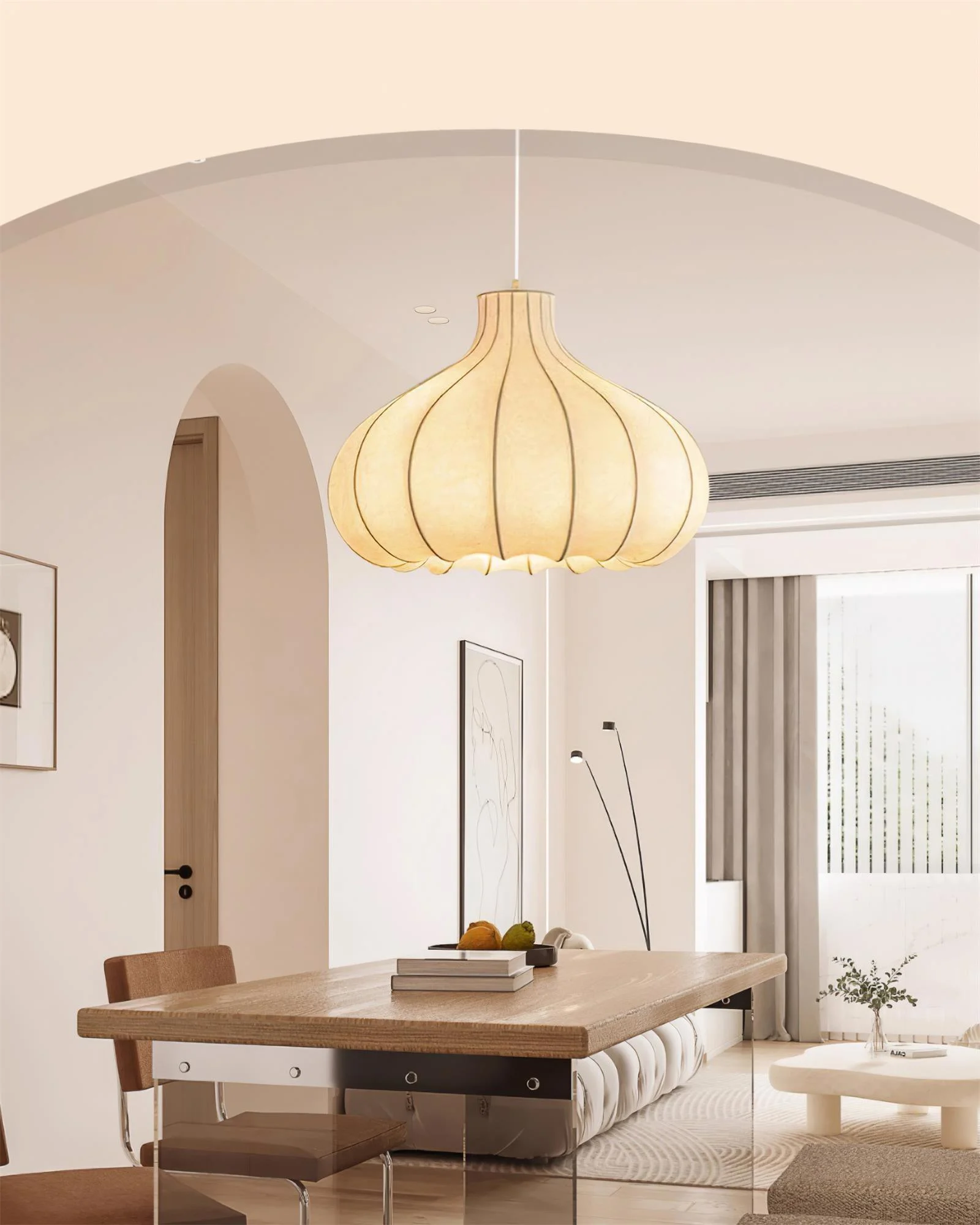 The Mosh Silk Pendant Lamp, with its mid-century cream aesthetic and sumptuous silk cocoon form, is a striking addition to any dining or bedroom setting. Its unique onion-dome shape reflects the intricate texture of a silkworm’s cocoon, creating a lighting fixture brimming with character and artistic tension. The circular frame cradles a three-dimensional artwork, reminiscent of natural coral elegance. Warm, golden light diffuses through the silk, casting a halo that symbolizes the cozy and gentle spirit of the indoor space.