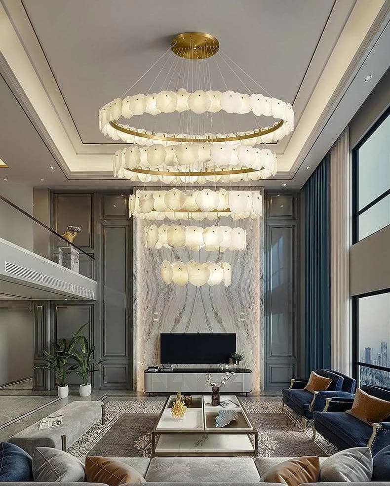 This beautiful multi-tiered Burton marble chandelier features a ring design. Exaggerated proportions and elegant marble embellishments fit in with the modern and luxurious design style. Suitable for living room, bedroom, restaurant, hotel, etc. This crystal chandelier will create a stunning and dazzling light effect.