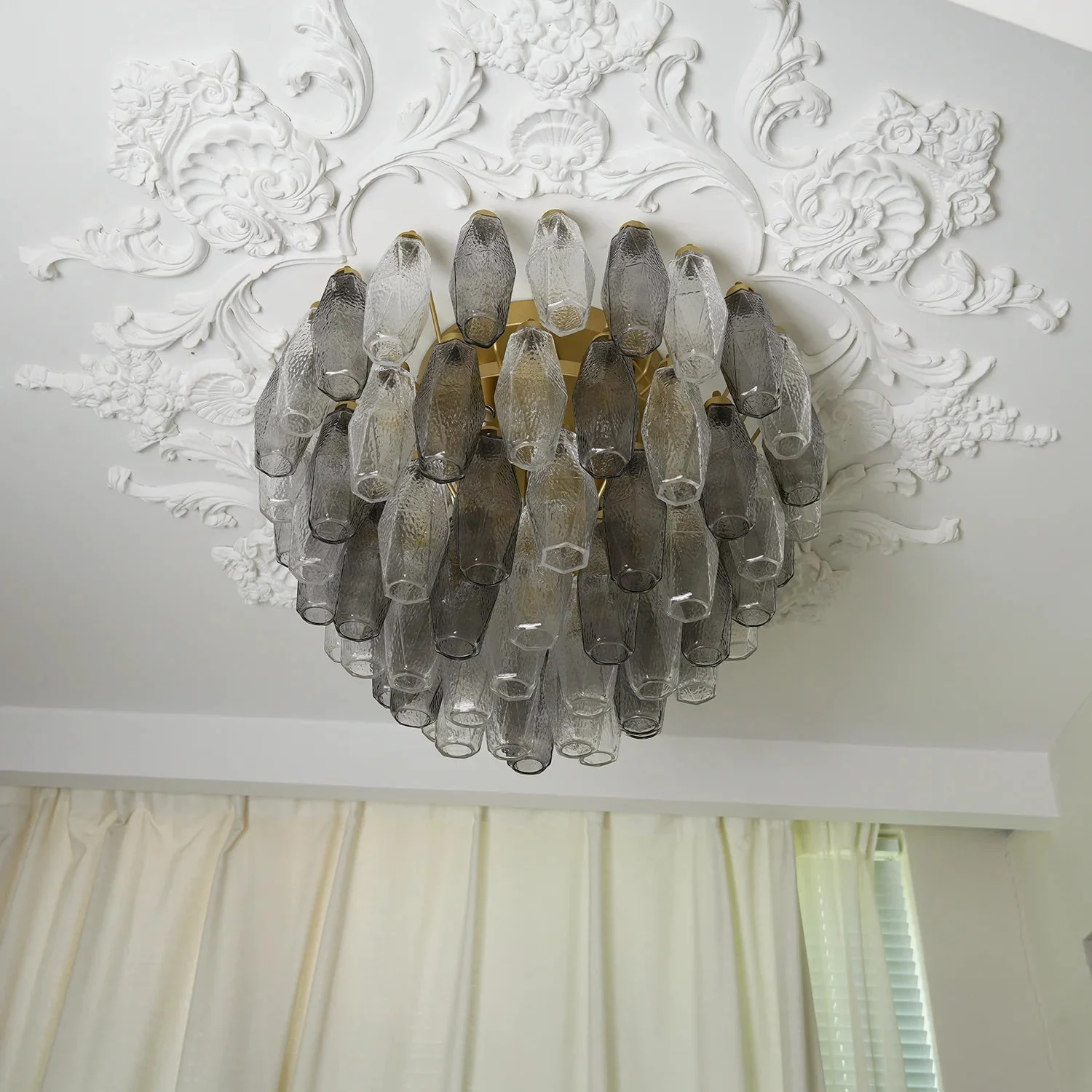 Transform any room into a work of art with the Murano Poliedri Transparent Smoked Ceiling Light. Crafted with elegant and smoky transparent glass pieces, this light adds a vibrant and dynamic atmosphere while seamlessly blending with your decor. Elevate your home with this masterpiece of glass craftsmanship!