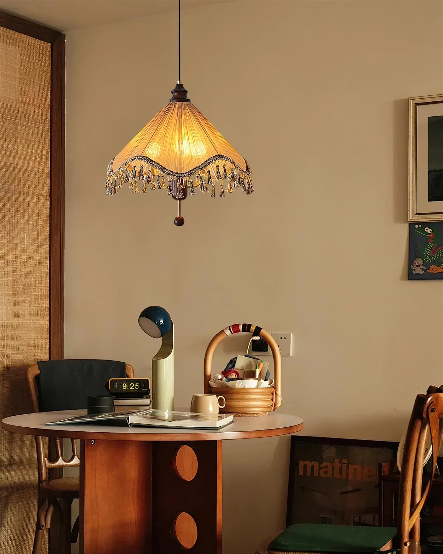 Introducing the Nadia Pendant Lamp, exclusively at Docos. This piece is a homage to the opulent elegance of a bygone era, featuring a delicately pleated golden shade adorned with sumptuous tassels and an ornate hanging finial. Crafted to cast a soft, ambient light, the Nadia is perfect for adding a touch of vintage glamour to any space.