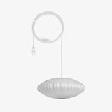 Its elegant lampshade is set on a steel base that is available with or without a walnut cover, and an easy-to-use on/off pull chain with a solid walnut end. The lamp also includes an 86-inch plug-in cord. The Nelson Bubble Lamps were first designed in 1952 when Nelson was inspired by set of Swedish hanging lamps. Their expensive price prompted Nelson to make his own set, and he arrived at an innovative process that replaced their silk shade with a translucent plastic material, making them available at a modest price.
