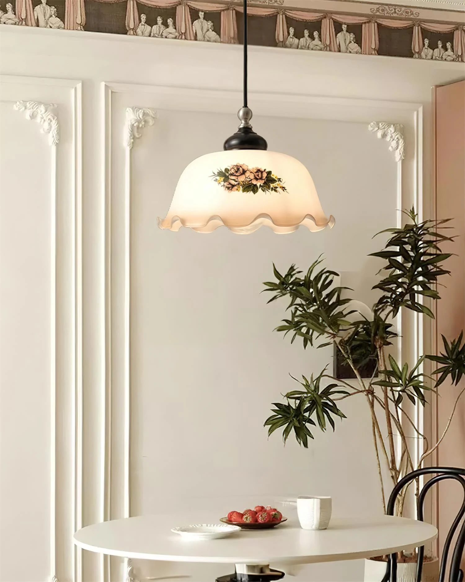 Add a touch of nature’s beauty to your interiors with the Nonna Floral Pendant Lamp. This fixture combines the classic elegance of a curved, frosted glass lampshade adorned with delicate floral motifs, with the rustic charm of its finely crafted metal fittings. Perfect for creating a soft, inviting atmosphere, this pendant lamp is an exquisite choice for anyone looking to enhance their space with a blend of traditional craftsmanship and natural allure.