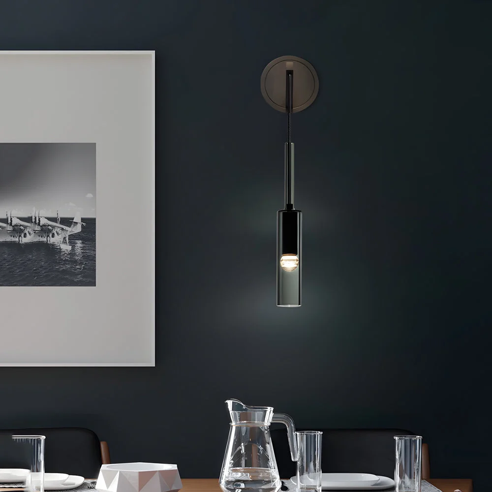 - Elevate your interior with our Nordic-inspired wall lights, boasting a luxurious copper finish. Each light is meticulously crafted from premium smoked borosilicate crystal and hand-machined solid brass, ensuring both durability and sophistication. The Long Stem Glass shade, reminiscent of a wine bottle, gracefully hangs from the wall-mounted base, black arm and suspending cord, then it adds a unique touch to any space.