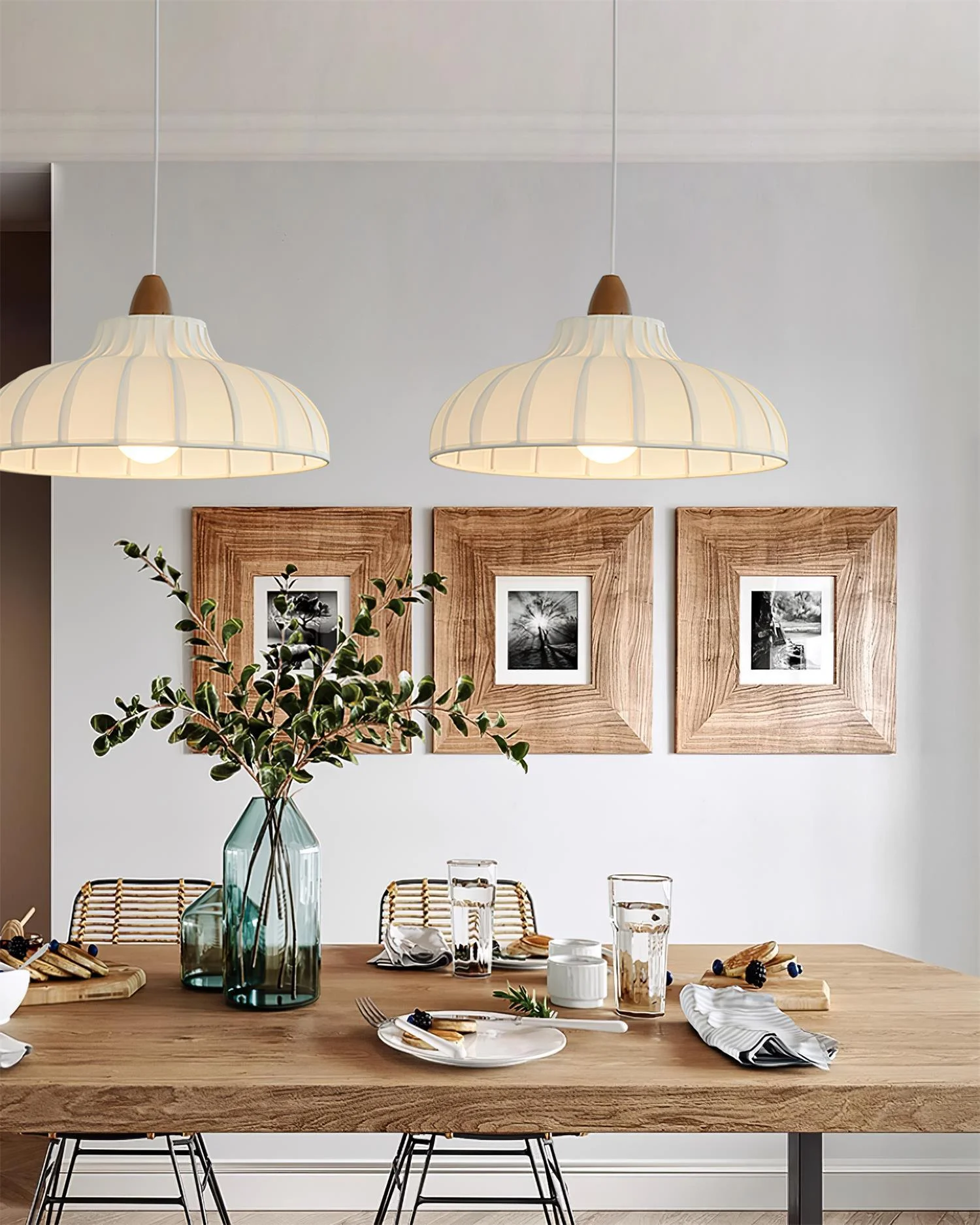 The Novelty Pendant Lamp a serene interpretation of Japanese minimalism fused with modern lighting design. This pendant lamp, with its graceful, fluted shade and warm, diffused light, captures the simplicity and calm of traditional Japanese aesthetics. The gentle curves and soft, fabric-like appearance of the shade are anchored by a rich, wooden detail, adding an organic touch to its overall elegance.