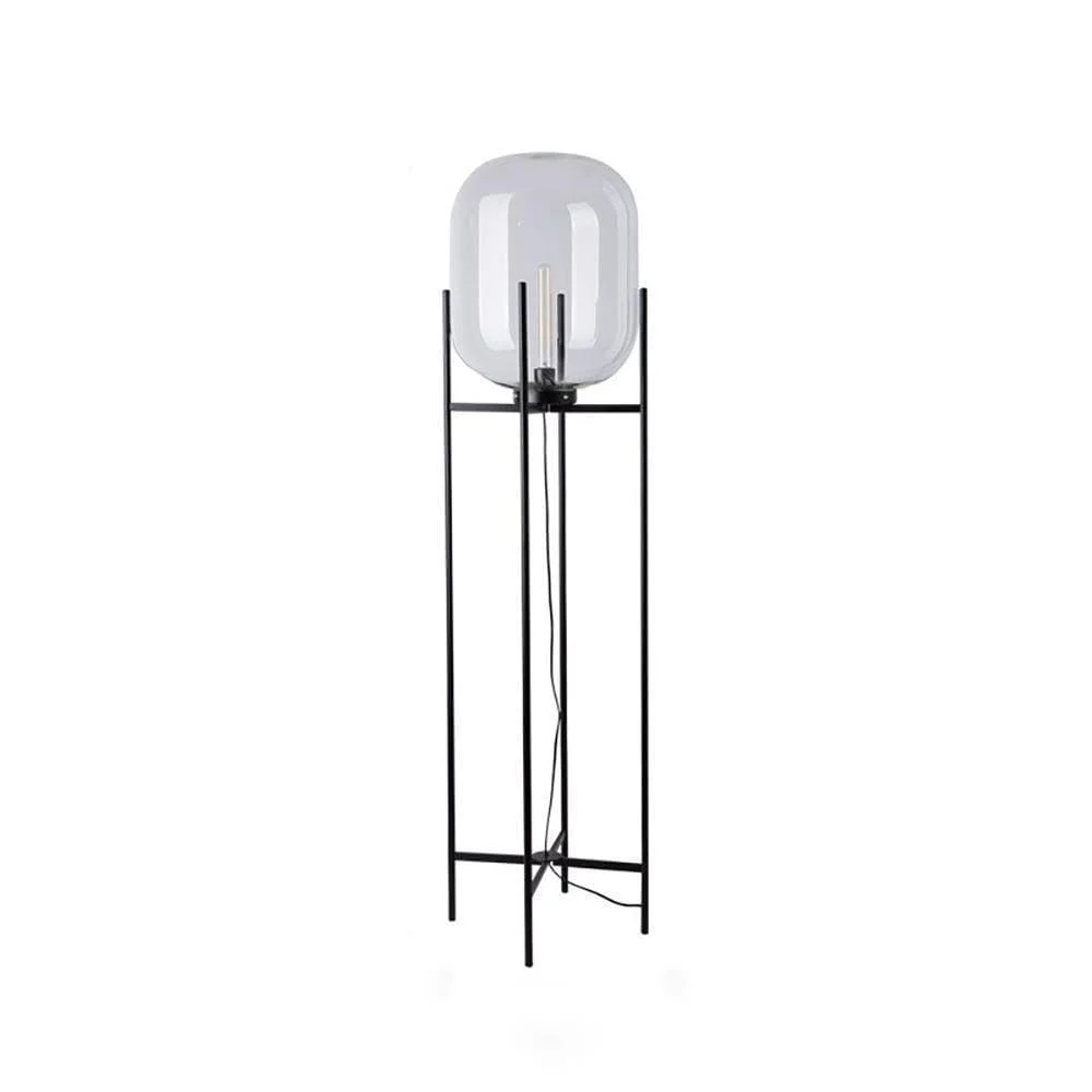 Oda floor lamp with hand blown glass corpus available in Transparent, grey, amber, light blue. Base in half round tube powder coated or chrome. Textile cable with hand switch, black or white.