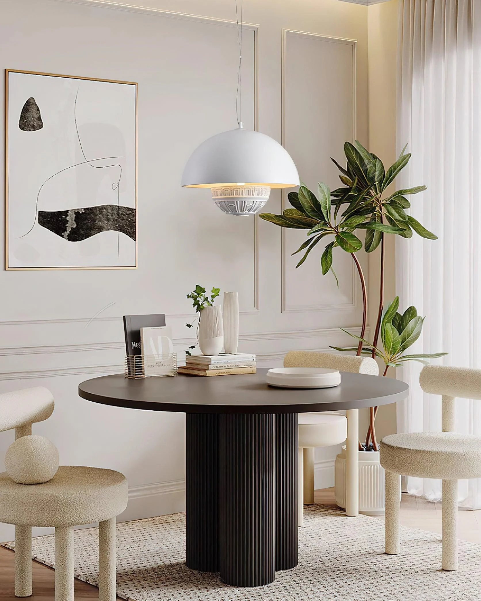 This Ofelia Pendant Lamp with its sleek hemispherical design, is elegant and modern, undoubtedly a focal point in any space. The exquisite metallic finish at the top complements the warm golden interior, not only adding a sense of luxury but also creating a cozy and comfortable lighting effect. The unique decorative ring detail at the base recalls the fine carvings of classical architecture, turning this fixture not merely into a source of light but a piece of art.