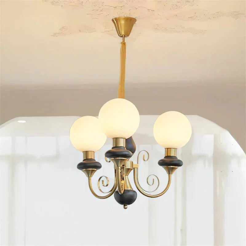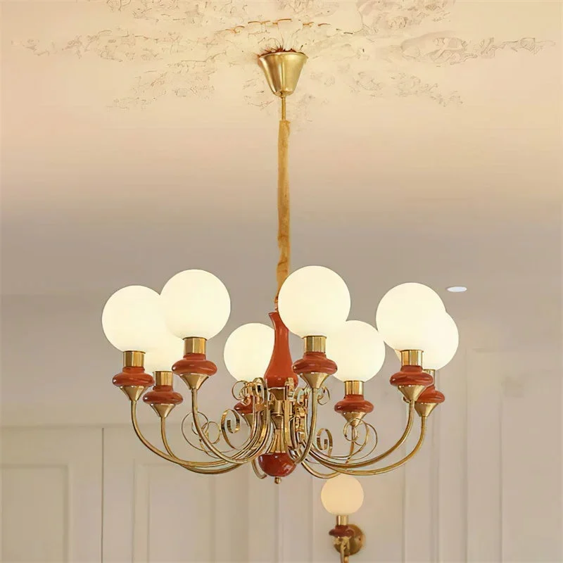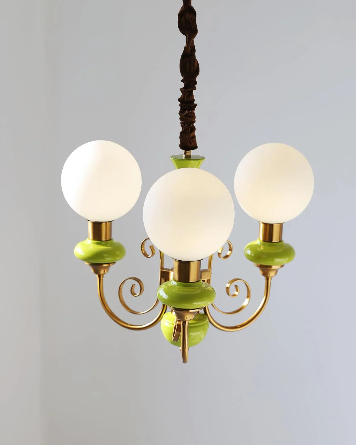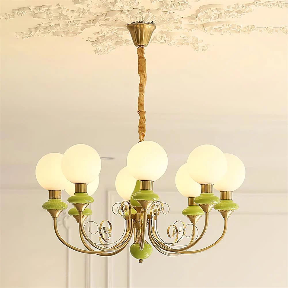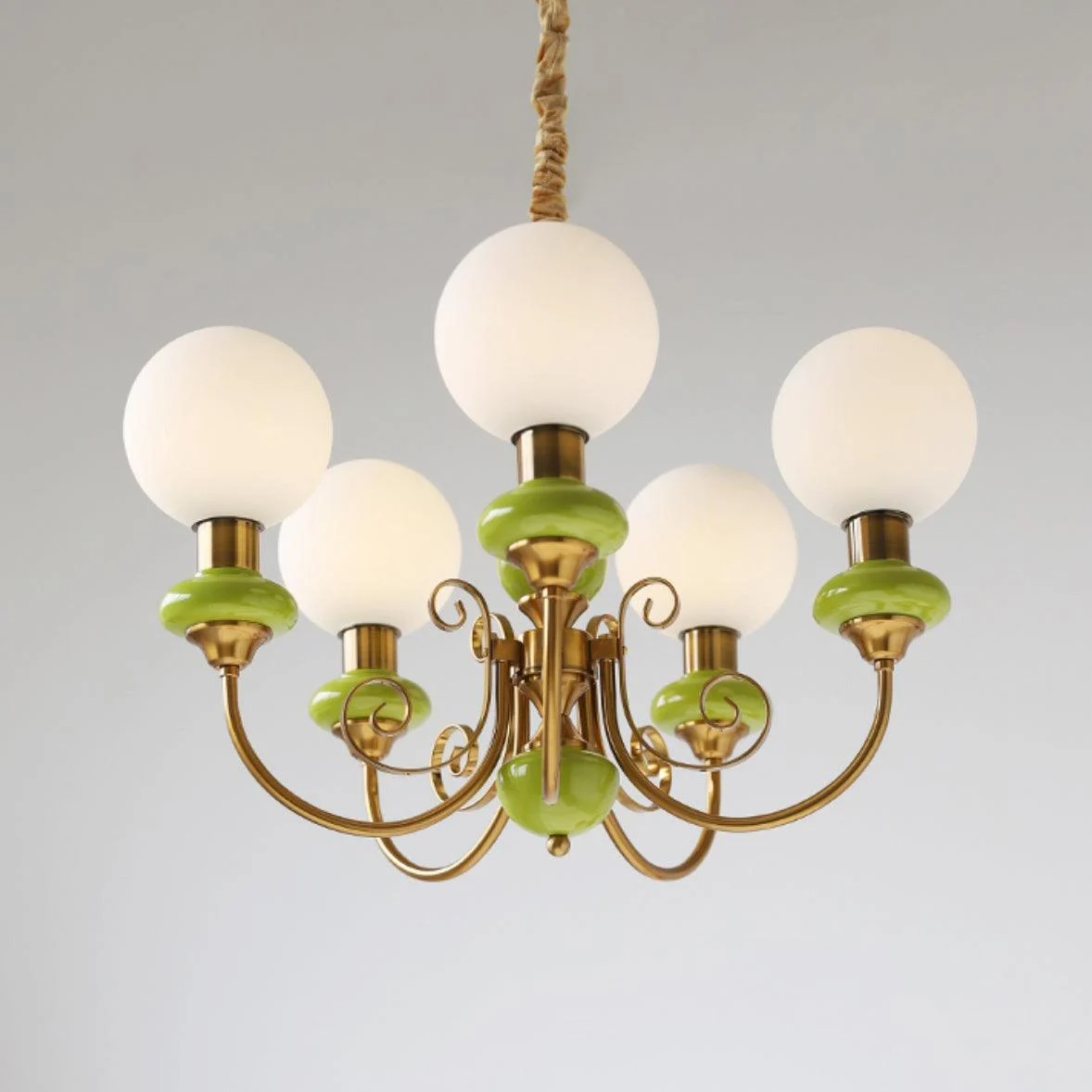 Discover the grandeur of the Onyx Chandelier, where classic design meets whimsical charm. This stunning fixture features a constellation of spherical, milky-white glass lights that emanate a soft, even glow. Each bulb is perched upon a glossy, apple-green base that injects a lively burst of color into the room. The chandelier’s arms are crafted in elegant, swirling gold, bringing a touch of vintage finesse and opulence to your dining room or foyer.