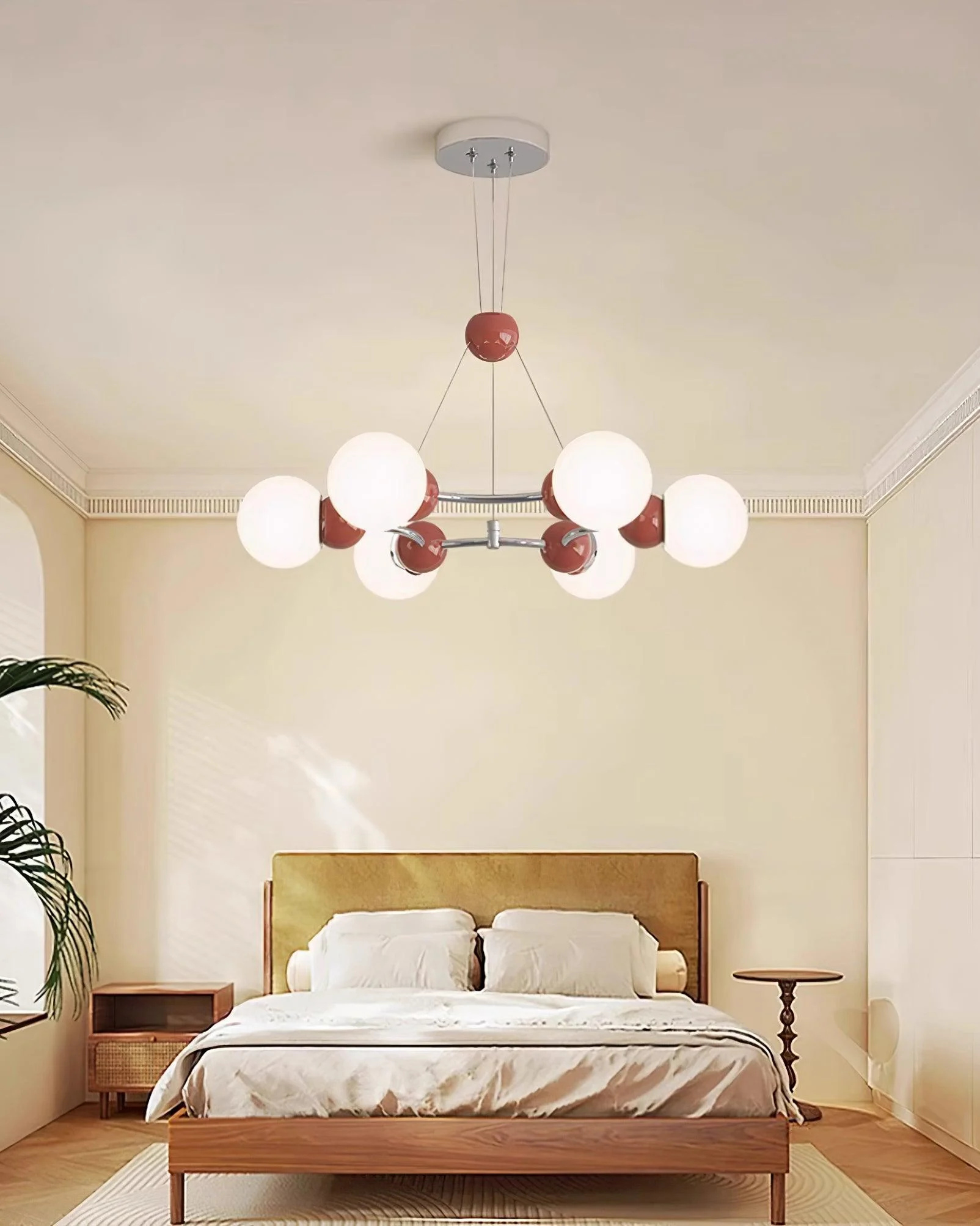 The Orbi Modern Chandelier a celestial-inspired masterpiece designed to transform any room into a bright and stylish space. This chandelier is a modern take on classic elegance, featuring a constellation of luminous orbs that gracefully orbit around a sleek, central axis. The warm glow from each frosted globe is perfectly balanced by the bold, fittings, adding a touch of earthy sophistication to its surroundings.