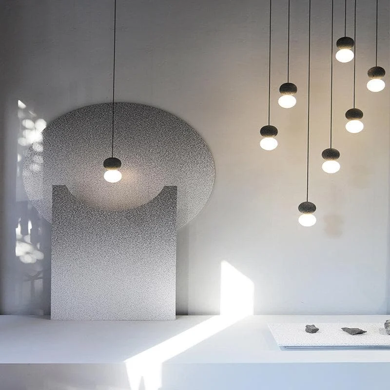 Geometry in its purest form. Origo embodies opposite essences mirroring volcanic rock and an opal glass diffuser. An exploration of interaction, light shining onto the texture of the volcanic rock, revealing its relief and contour. Sober and logical, both materials create a relationship between light and composition. Balance in its essence, lightness, and heaviness is expressed through a timeless piece. Spheres work as a double geometry, mirroring positive and negative. Reinforce the fundamental relationship between light and shadows.