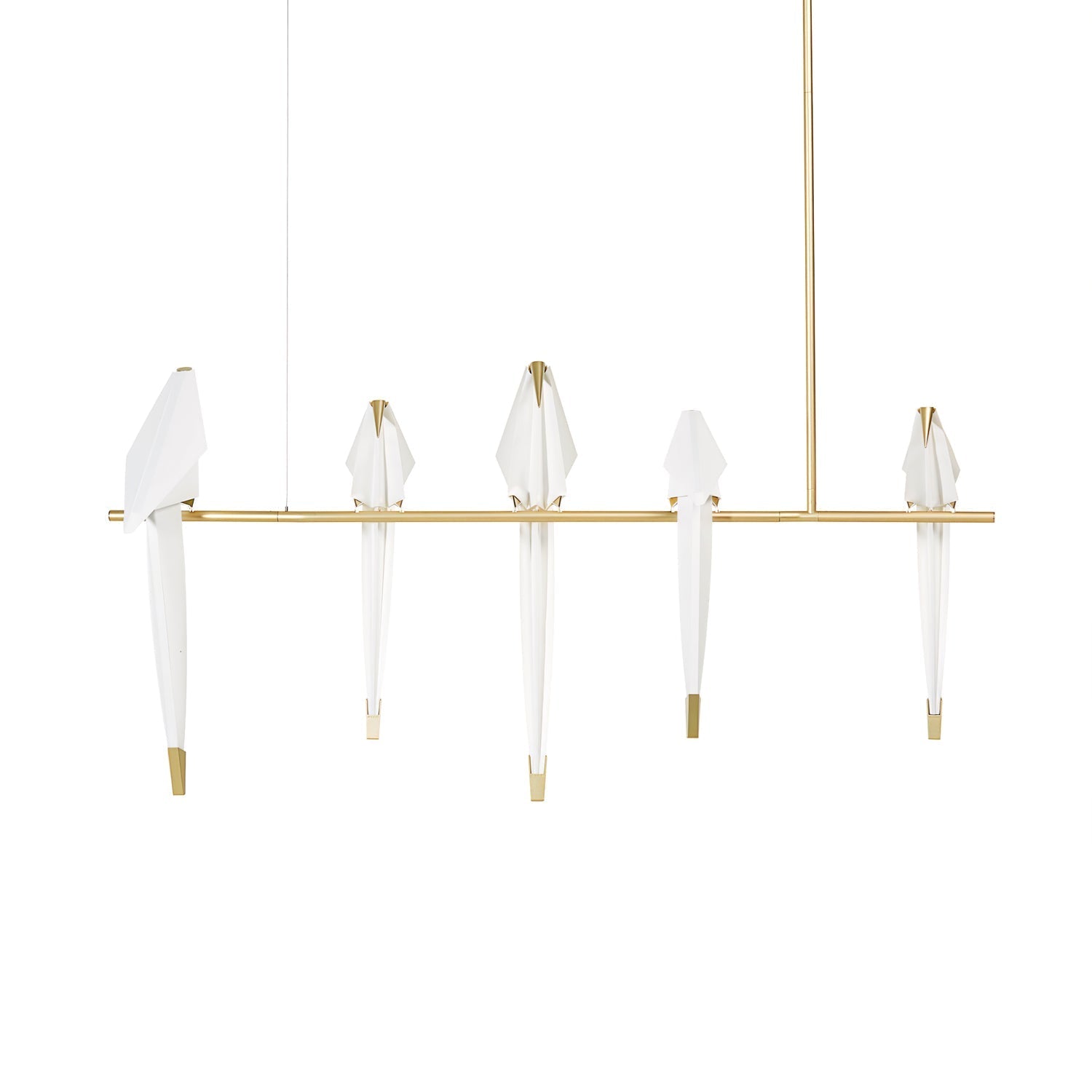 A family of sculptural lamps celebrates the beauty and poetry of a bird perched on a branch, rocking darkness away when set in motion. Crafted from the paper in the form of an abstract bird sitting on a branch, these sunlit birds are free to swing when softly touched, gently glowing and bringing along the promise of spring.