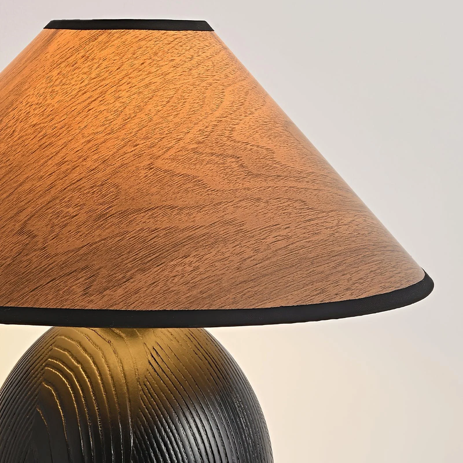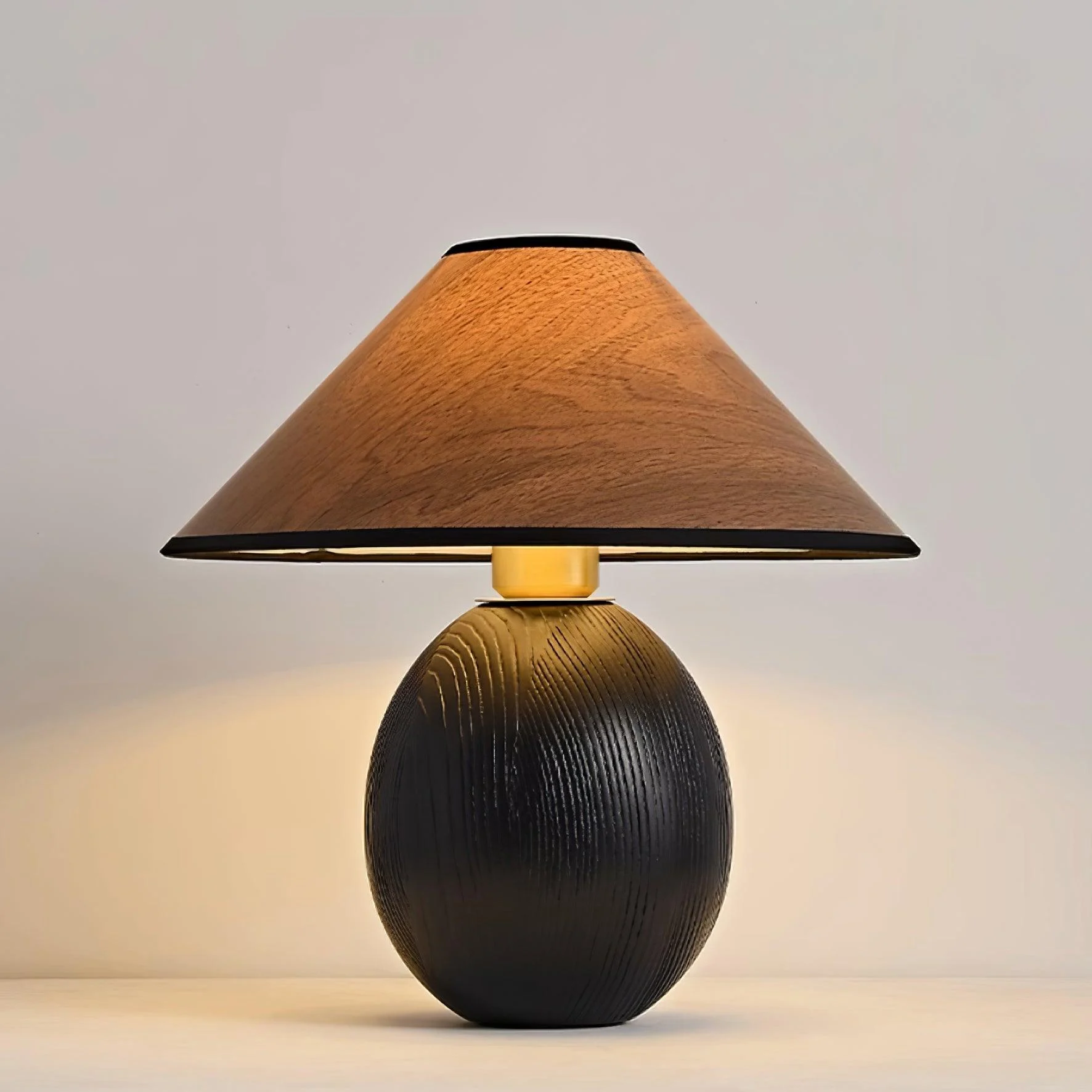Discover the rustic charm of the Penna Table Lamp, a masterpiece that captures the essence of artisanal craftsmanship. The base, shaped like a smooth, polished pebble from a tranquil riverbed, is crafted from the finest wood. It is stained in a rich walnut hue that highlights the natural beauty of the grain. Above, a conical shade in a complementary earthy texture bathes your room in a warm, diffused light, reminiscent of a cozy cabin retreat.