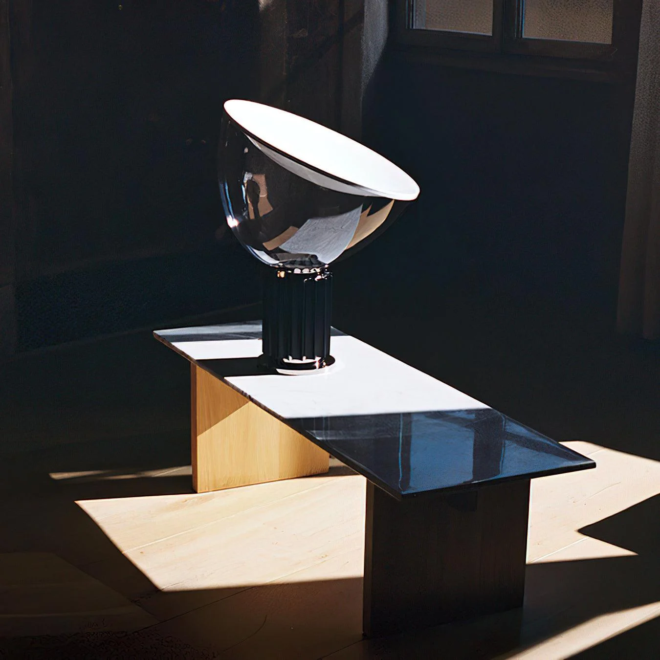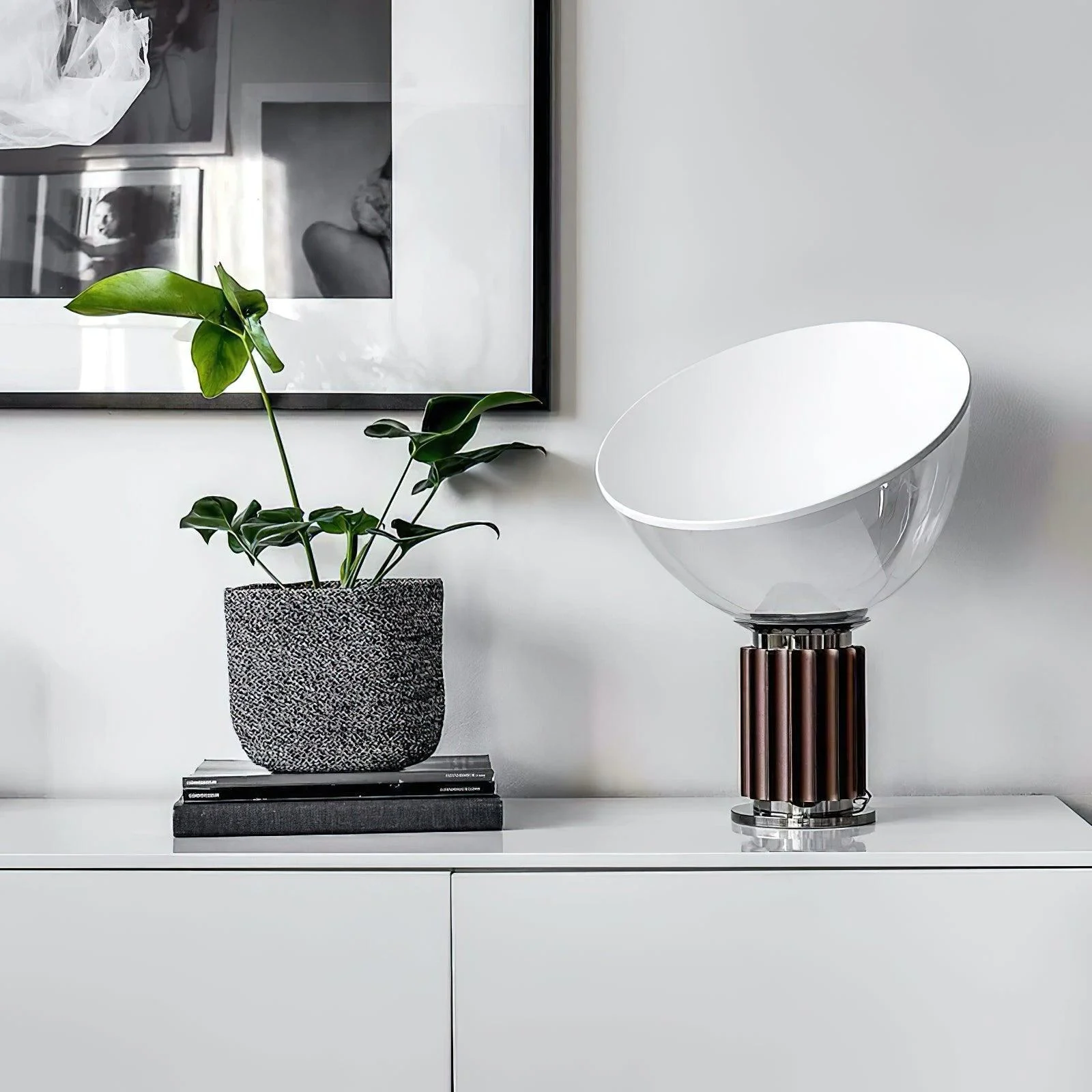 The Plata Table Lamp a testament to timeless design, captivates with its illusion of an inverted pendant light. This contemporary reinterpretation, a more compact counterpart to the iconic 1962 original, preserves the design’s ingenious essence. It features a meticulously painted aluminum reflector, its interior boasting a gleaming gloss white finish, while the exterior is rendered in a subtle matte. The lamp’s diffuser, a piece of exquisite transparent blown glass, introduces an element of dynamic versatility, allowing the direction of light to be adjusted at will.