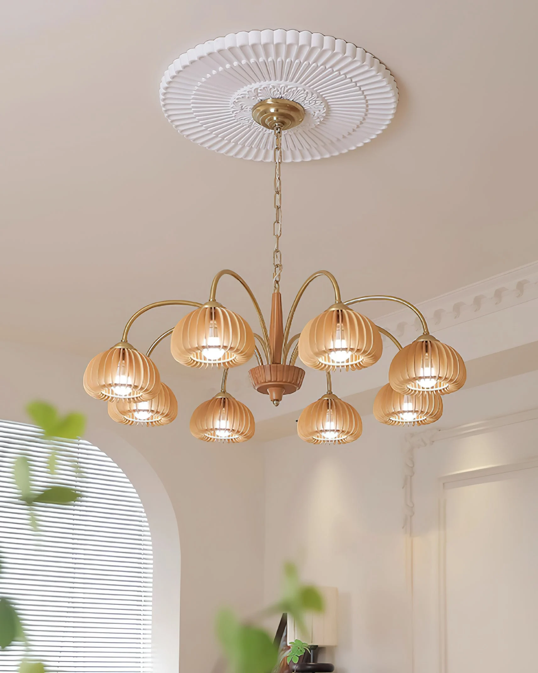 This charming light fixture is a whimsical nod to the pumpkin patch, with its ribbed, golden glass shades that mimic the plump curves of a pumpkin. Dangling elegantly from a linked chain, this chandelier is a harvest of light, perfect for bringing a smile and a cozy glow to your favorite spaces. It’s a festive centerpiece year-round, ready to enchant with its playful silhouette and warm, inviting luminescence.