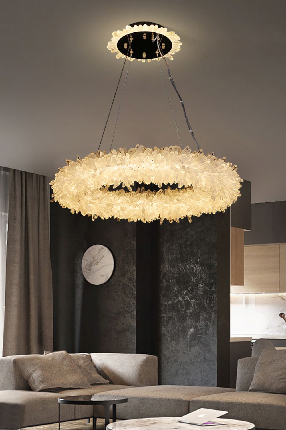 The Quartz Crystal Chandelier utilizes the finest and most exclusive natural crystals, LED strips, and nearly unnoticeable cables to produce a mesmerizing floating display. Each luminous halo is crafted by hand and adorned with its own set of crystals for a truly one-of-a-kind piece.