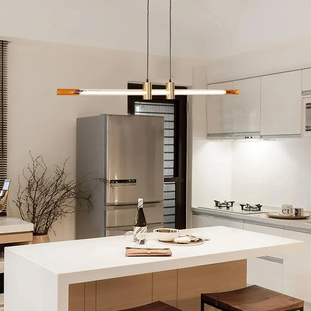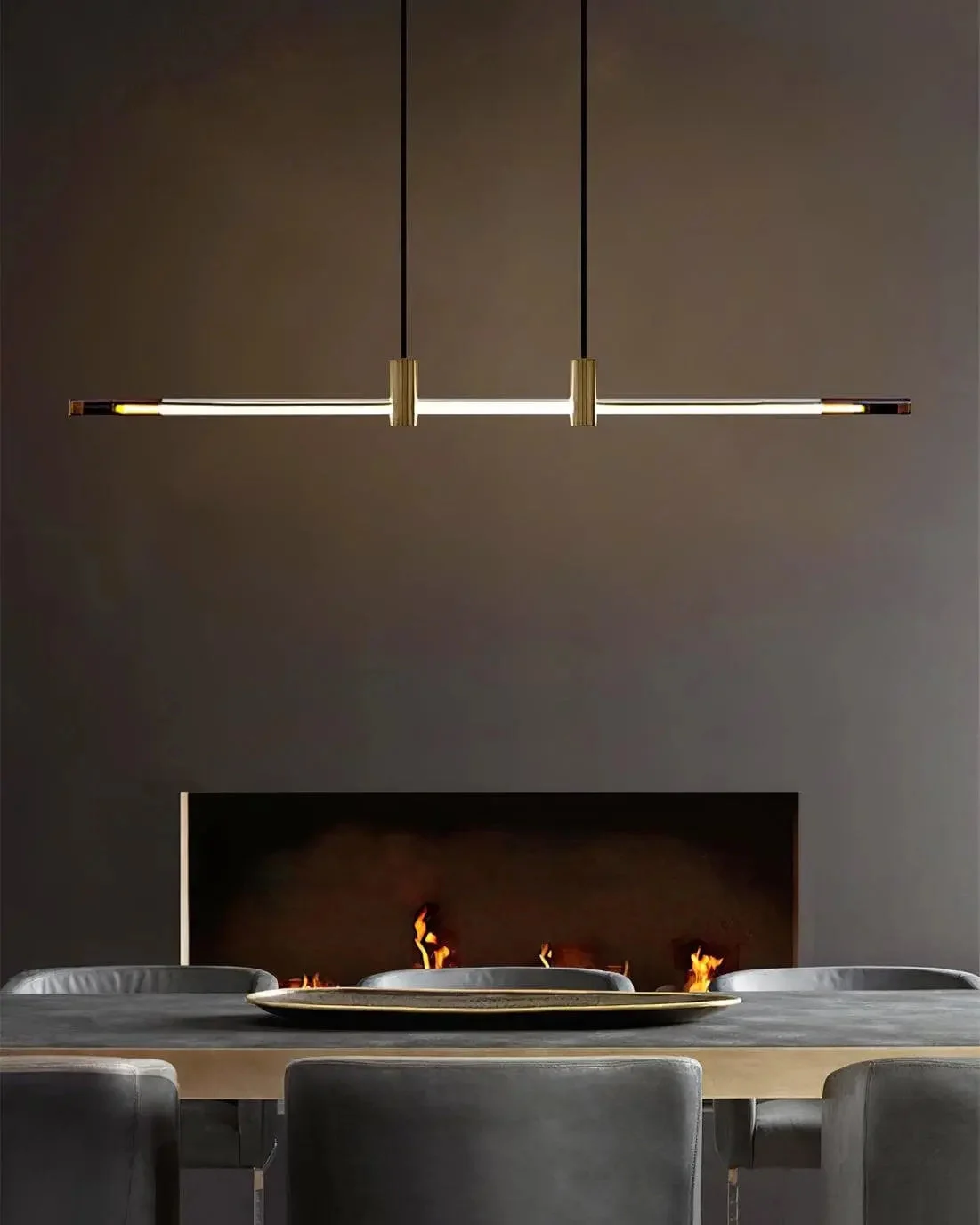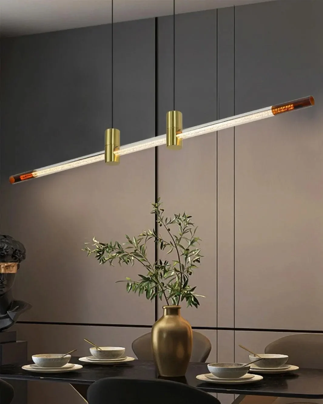 It’s a sleek, elegant piece that lies in the area of modern and downright futuristic. Light passes through the tube and stops in between the amber colored accents at the ends, for an overall sharp ambient light. It is the ideal piece over a minimalistic dining room table