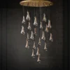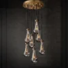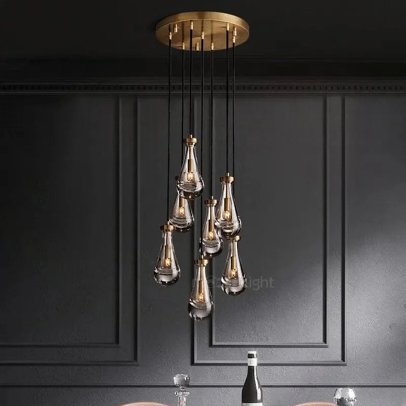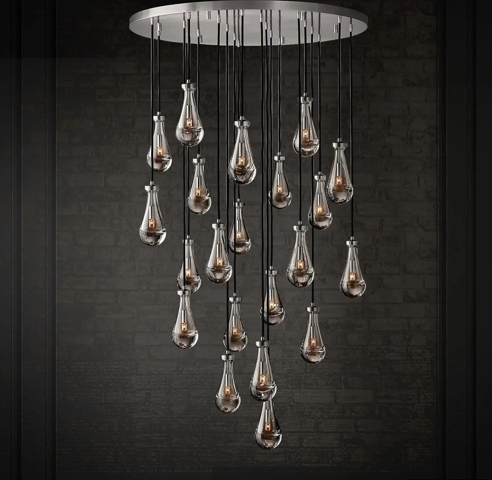 Raindrop Linear Chandelier. Engaging the viewer in an ever-changing pattern of expansion and compression – much like the rhythm of a rainstorm itself. Suspended from slim black cords, drops of blown glass encase the bulbs – creating the illusion of underwater illumination – and cast luminous ripples that wash across ceilings and walls.
