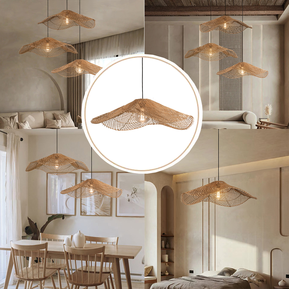 We make our lampshade by hand out of rattan. Despite its straightforward design, the product adds appealing elegance and shines in any setting. To make a stunning chandelier, you can combine as many lights as you like.