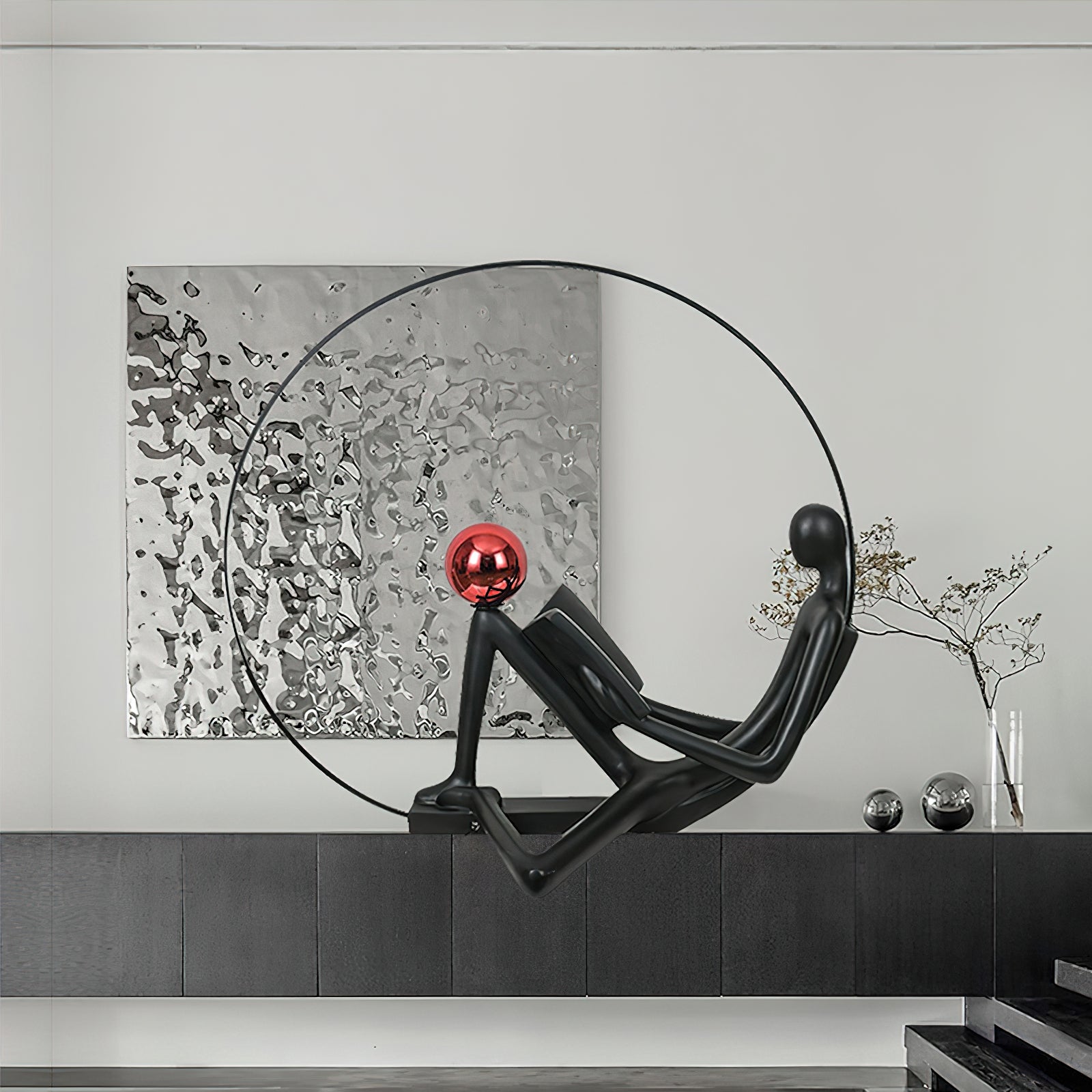 The Reader Sculpture Floor Lamp is inspired by the serene and contemplative act of reading. This artistic floor lamp features a sleek, modern figure in a relaxed pose, engrossed in a book, with a luminous orb beside them. The elegant, circular frame symbolizes the infinite world of knowledge and imagination that books provide.