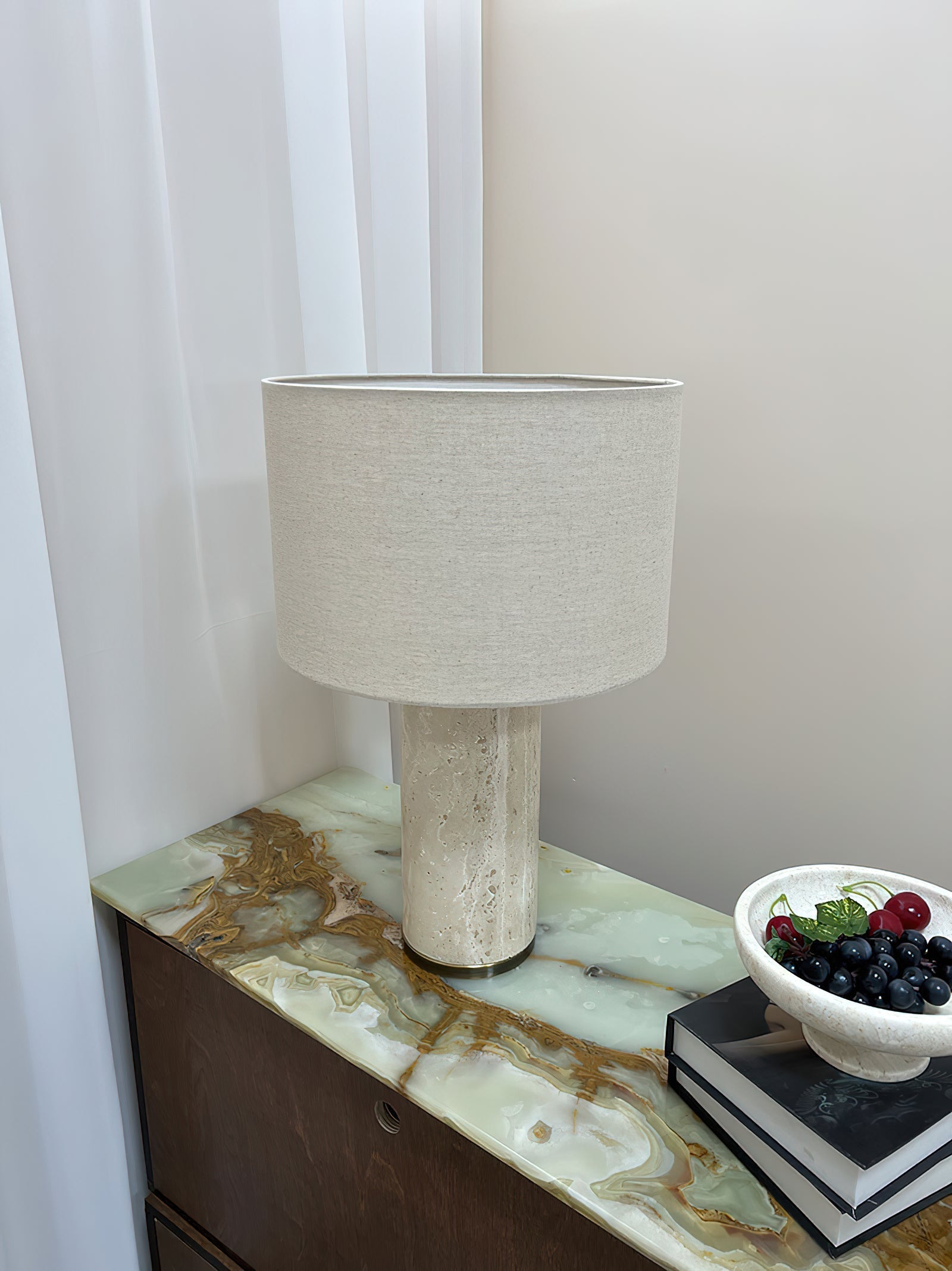 Expertly made from marble, known for its unique color variations and natural inclusions, this lamp is truly one-of-a-kind. Drawing inspiration from the interiors of 180 House on the Strand, it boasts refined metal accents and includes a natural linen shade.