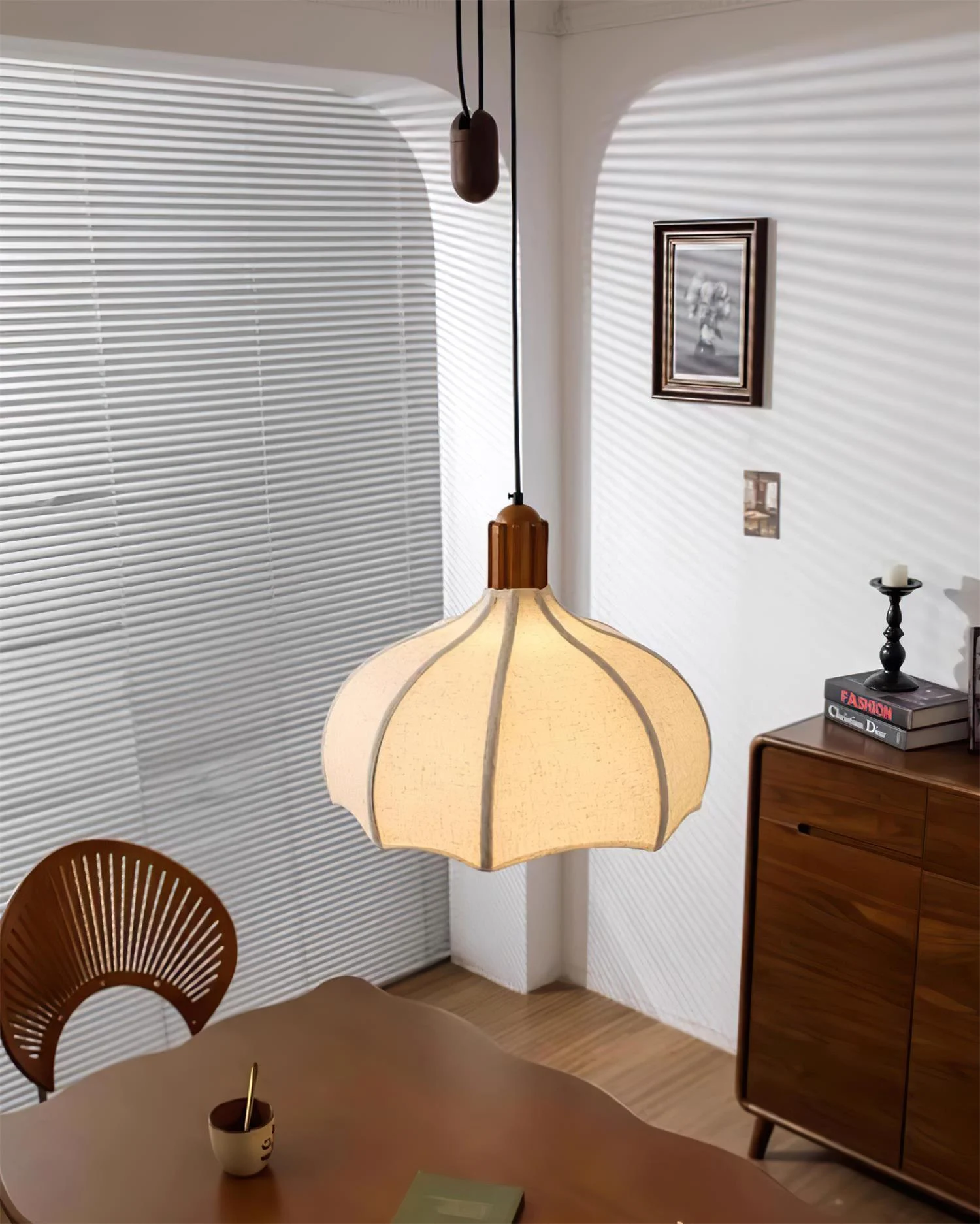 The Revi Liftable Pendant Lamp blends vintage elegance with modern functionality. Its wooden frame gracefully supports a soft fabric lampshade, creating a warm, diffused glow. The adjustable pulley system allows effortless height customization, adapting to different spaces and moods.