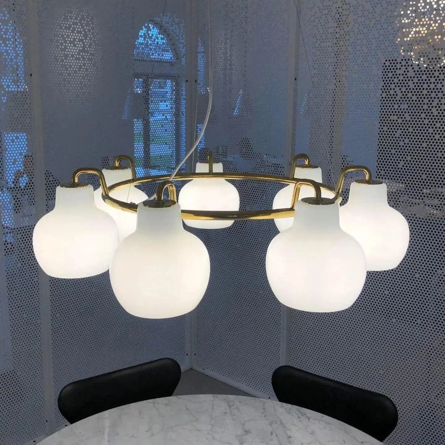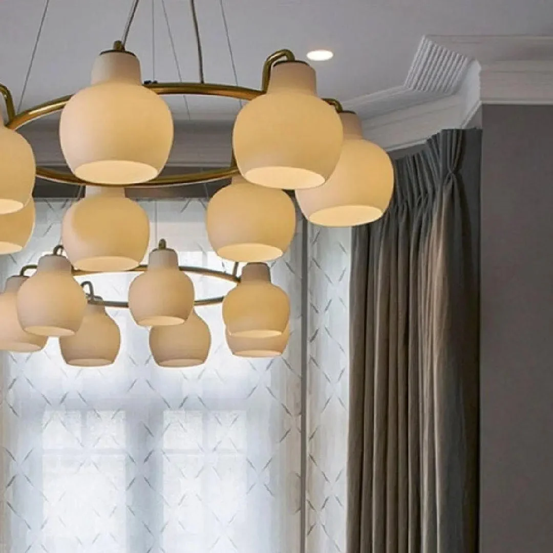 Ring Crown Chandelier family brings a distinct and authentic touch to stylish interiors as well as a warm light to softly illuminate contemporary living. Ring Crown Chandelier emits light directed primarily downwards. The opal glass provides a comfortable and uniform illumination of the area around the fixture.