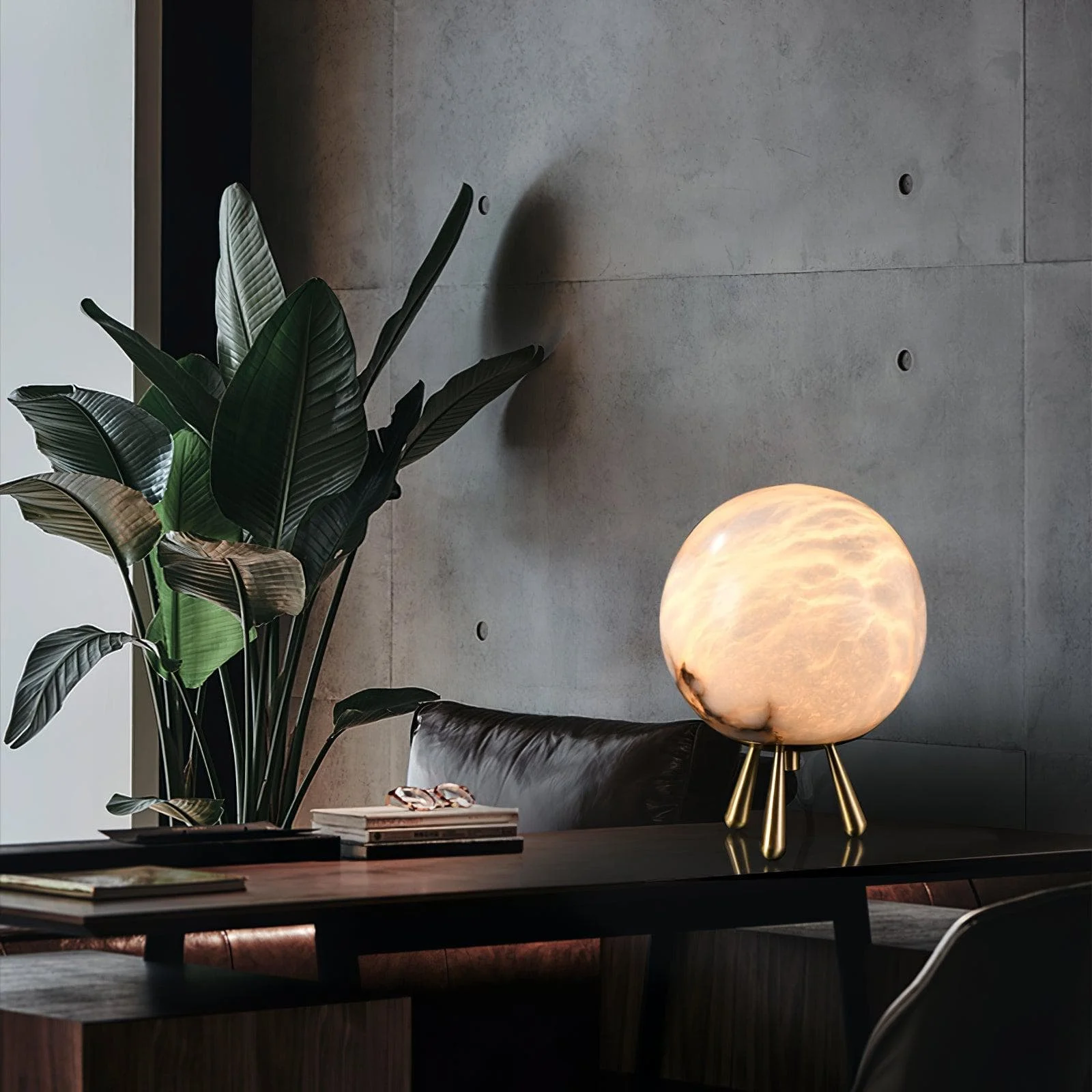 This Romi table lamp, part of the alabaster Collection, entirely handmade, emphasizes the properties of alabaster as a diffuser, with its warm color and texture of its amber veins that are always different from each other, producing a unique piece every time and recalling the magic atmosphere of full moon nights.