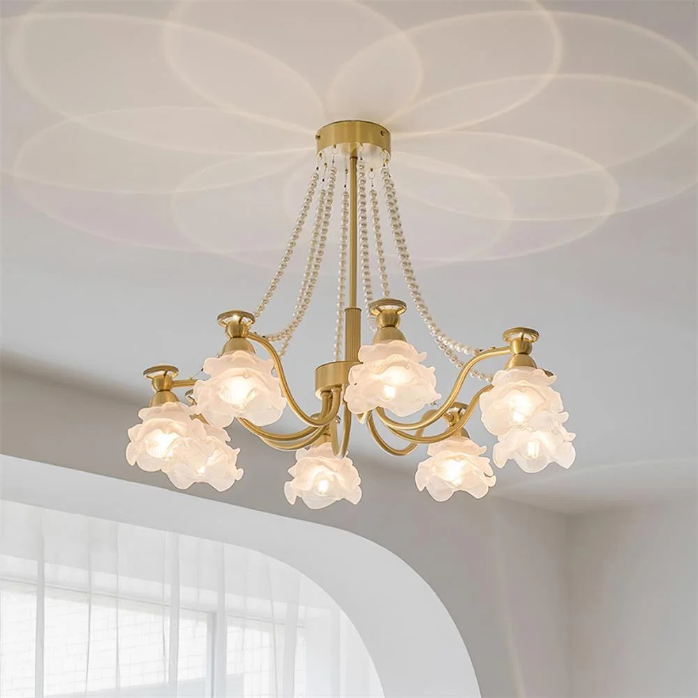 Elevate your living space with the Roses Landi Chandelier – an exquisite fusion of classic charm and contemporary chic. This chandelier boasts a bouquet of blooming roses, each petal sculpted from luminous glass to capture and reflect light in a dance of brilliance. Draped elegantly with delicate chains, it exudes a regal air, while the warm golden tones of its frame add a touch of opulence.