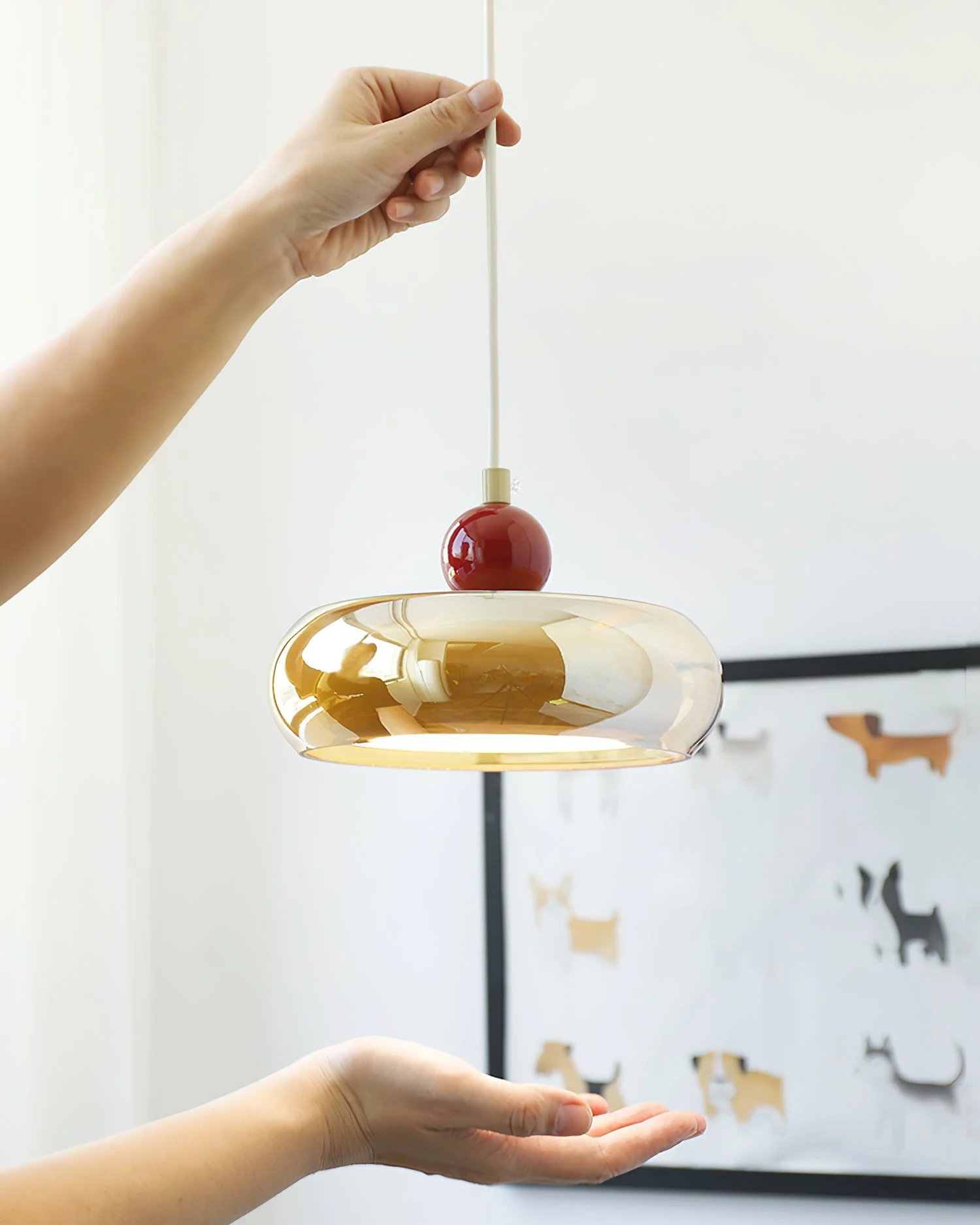 Discover the elegance of the Rotan Pendant Lamp, where modern design meets playful sophistication. This pendant lamp features a striking Cognac glass shade that emits a warm, inviting glow, perfectly complemented by the bold red accent at the top. Its sleek and rounded form adds a touch of contemporary flair to any space, making it an ideal centerpiece for dining areas or living rooms.